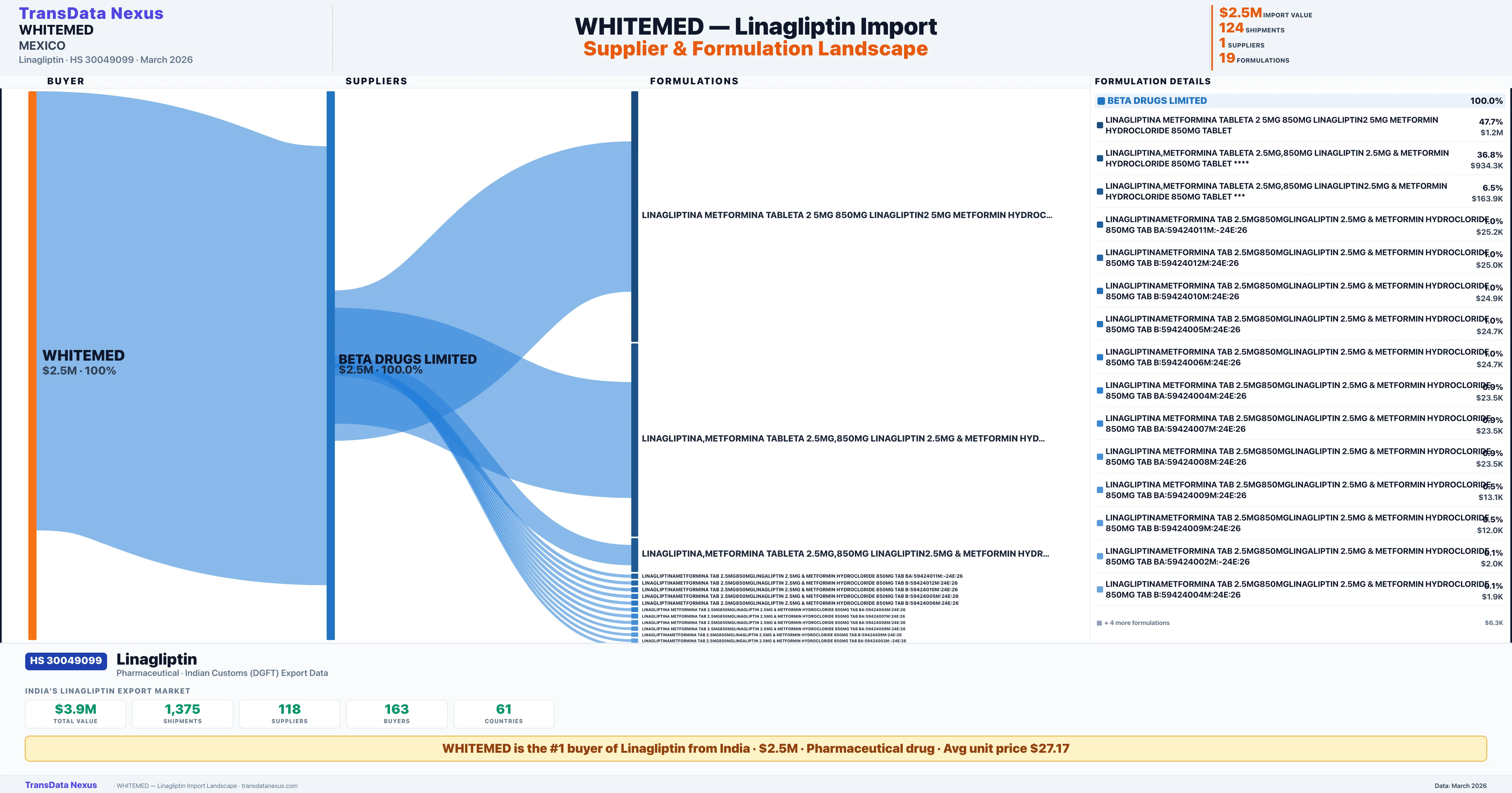 WHITEMED imports 19 distinct Linagliptin formulations from India. The top formulation is LINAGLIPTINA METFORMINA TABLETA 2 5MG 850MG LINAGLIPTIN2 5MG with 54 shipments worth $1.2M.