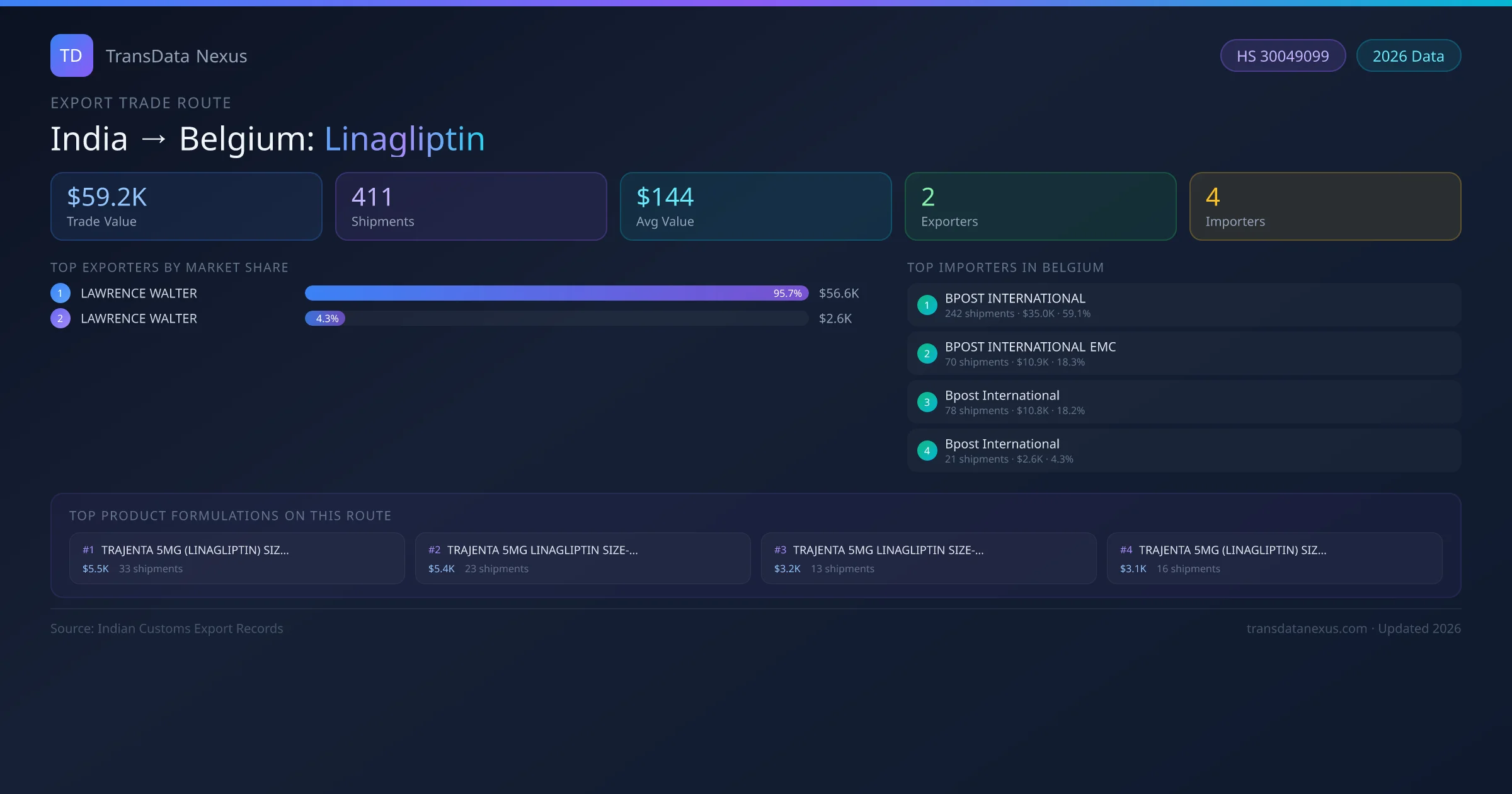 The India to Belgium Linagliptin corridor is one of India's established pharmaceutical export routes, with 411 shipments documented worth a combined $59.2K USD. The route is dominated by LAWRENCE WALTER, which alone accounts for roughly 96% of all export value, reflecting the consolidated nature of India's linagliptin manufacturing sector.
