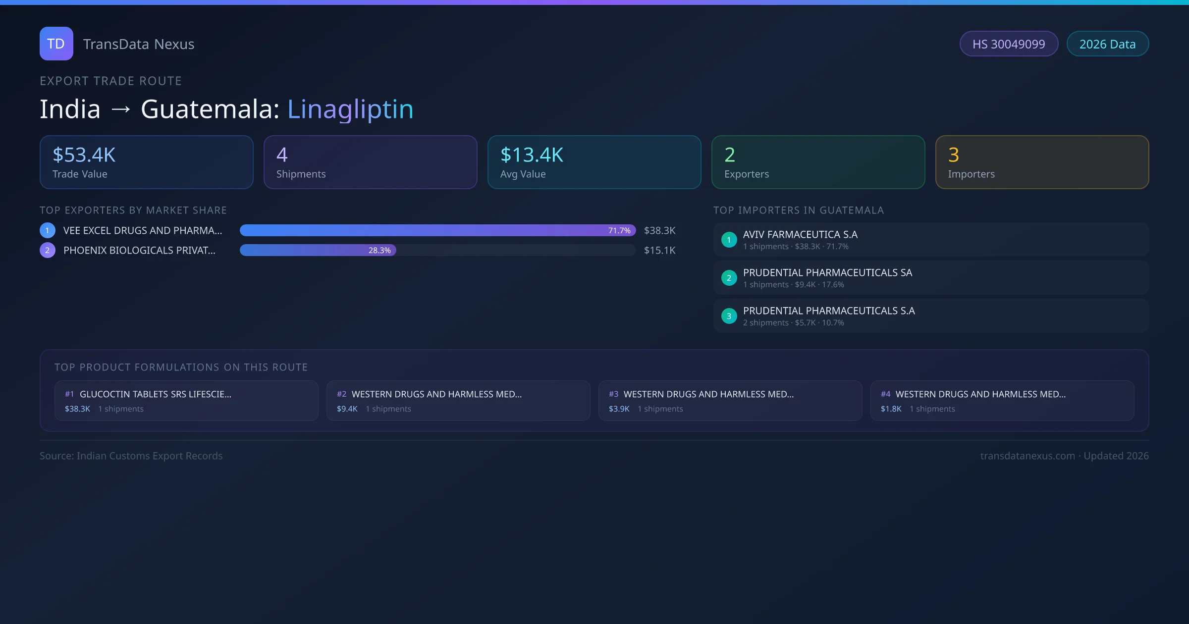 India has recorded 4 verified shipments of Linagliptin exported to Guatemala, representing a combined trade value of $53.4K USD. This corridor is served by 2 active Indian exporters, with an average shipment value of $13.4K USD. The leading Indian exporter is VEE EXCEL DRUGS AND PHARMACEUTICALS PRIVATE LIMITE, which accounts for 72% of total export value with 1 shipments worth $38.3K USD. On the buying side, AVIV FARMACEUTICA S.A is the largest importer in Guatemala with $38.3K USD in purchases. All data sourced from Indian Customs (DGFT) shipping bill records. Values reported in FOB USD.