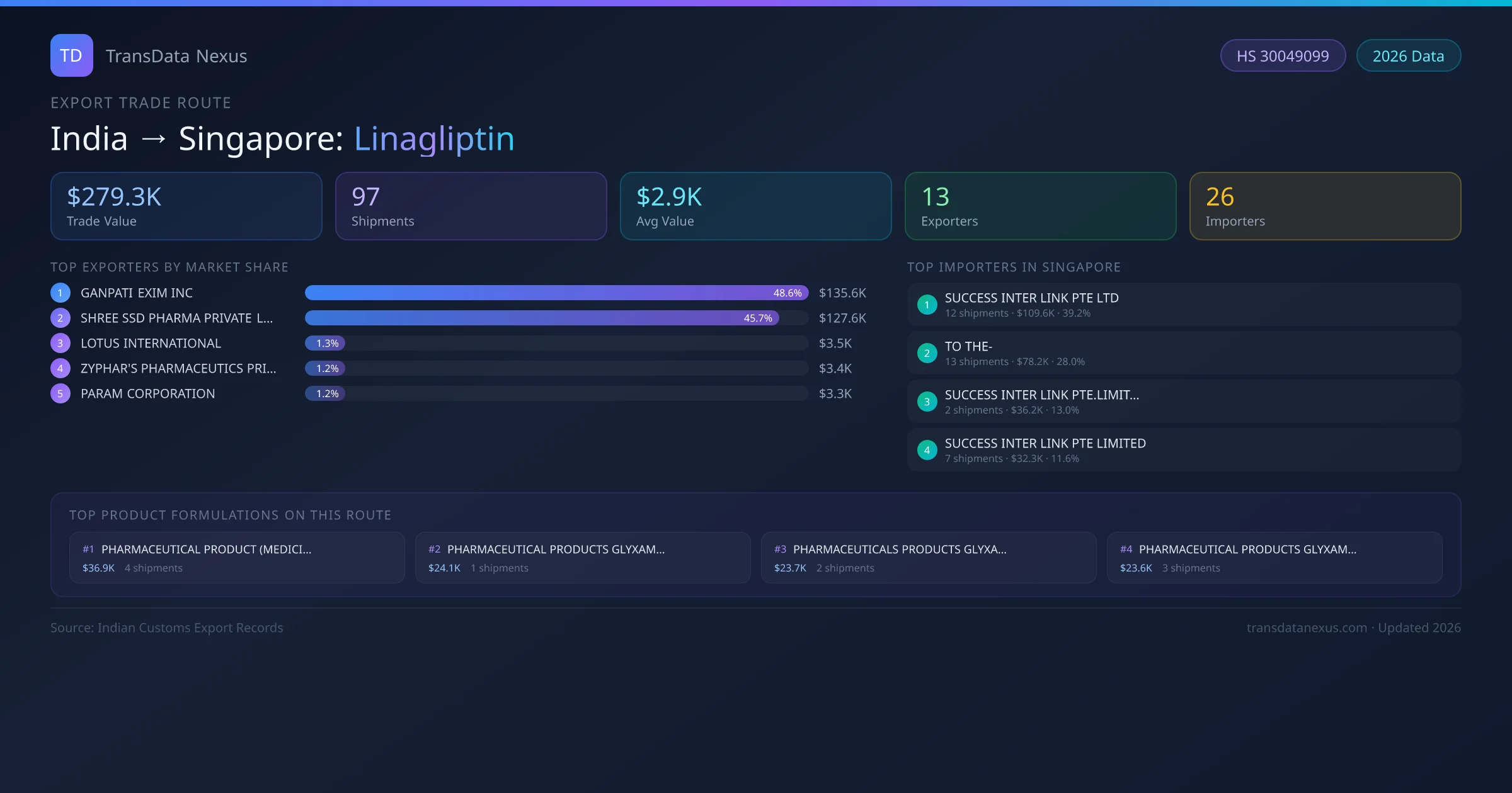 On the buying side, SUCCESS INTER LINK PTE LTD is the largest importer with 12 shipments worth $109.6K USD — representing 39% of all linagliptin imports from India on this route. A total of 26 buyers are active on this corridor.