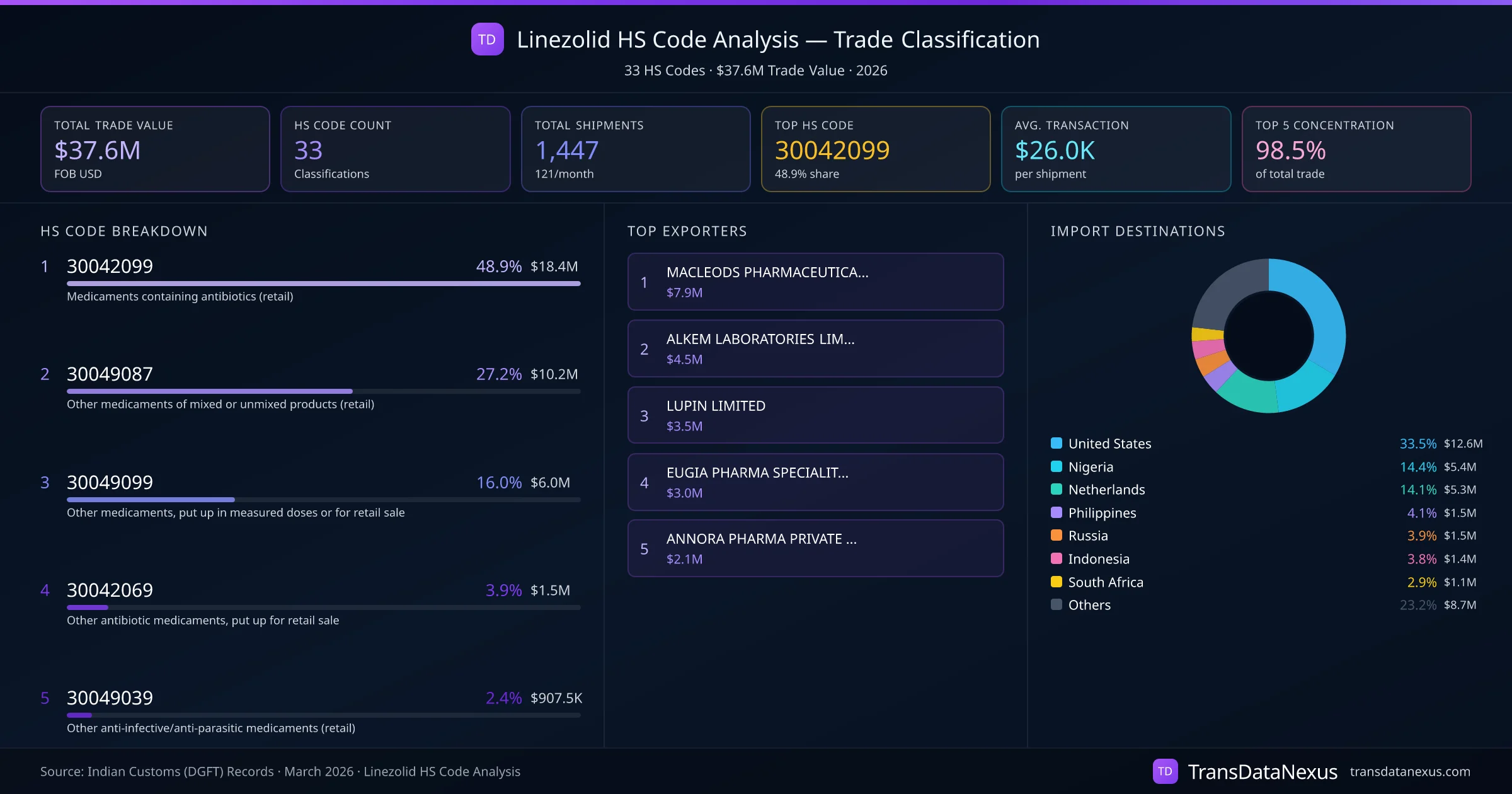 India exports Linezolid under 33 distinct HS code classifications, representing a total trade value of $37.6M across 1,447 shipments. The dominant classification is HS 30042099 (Medicaments containing antibiotics (retail)), accounting for 48.9% of all Linezolid trade at $18.4M. HS 30049087 (Other medicaments of mixed or unmixed products (retail)) follows at 27.2% ($10.2M). The top 5 HS codes together account for 98.5% of total Linezolid trade from India. The average transaction value is $25981. Key importing markets include United States, Nigeria, Netherlands. Leading exporters include MACLEODS PHARMACEUTICALS LTD and ALKEM LABORATORIES LIMITED. Data sourced from Indian Customs (DGFT) shipping bill records.