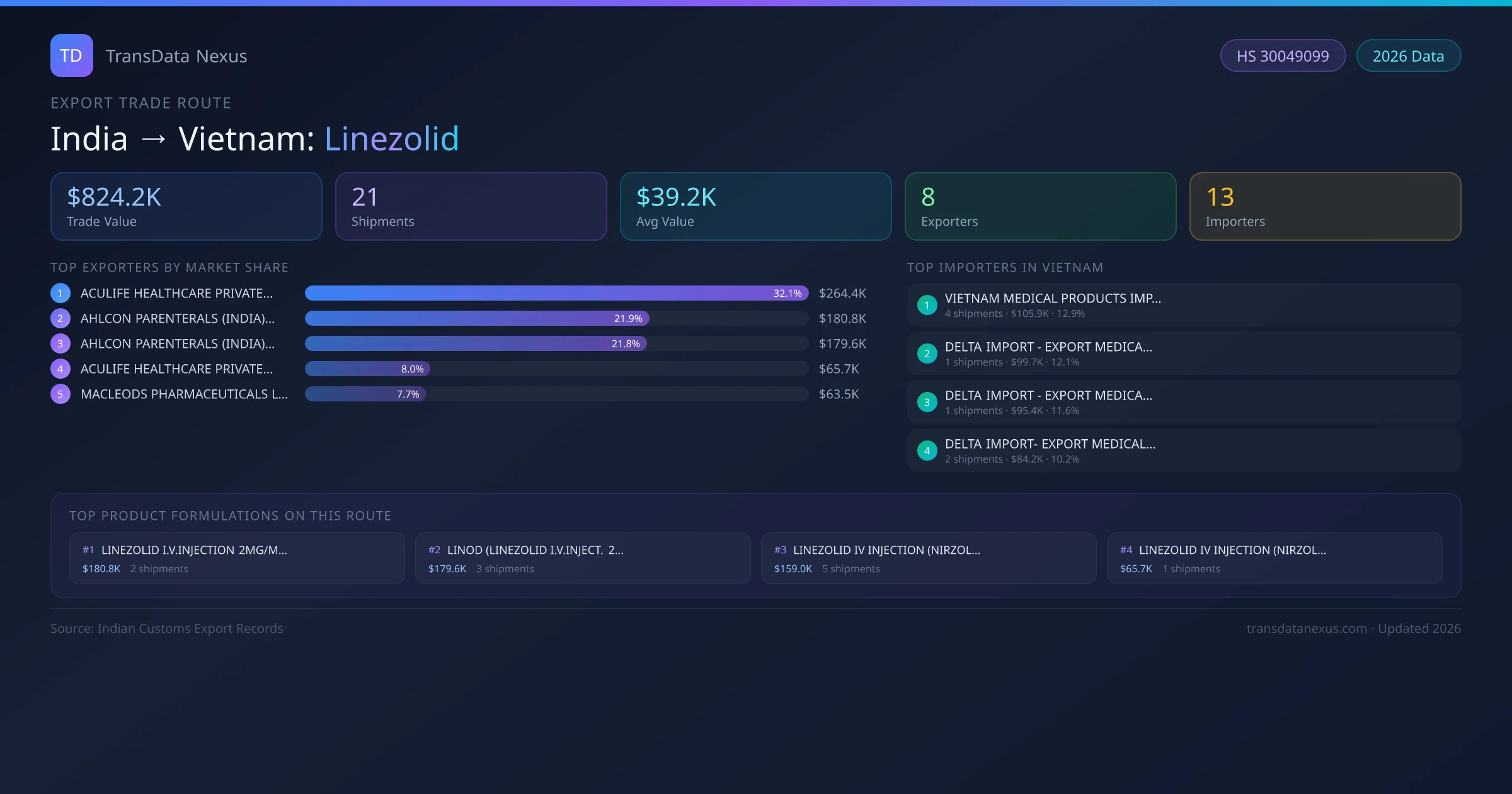 India has recorded 21 verified shipments of Linezolid exported to Vietnam, representing a combined trade value of $824.2K USD. This corridor is served by 8 active Indian exporters, with an average shipment value of $39.2K USD. The leading Indian exporter is ACULIFE HEALTHCARE PRIVATE LIMITED, which accounts for 32% of total export value with 7 shipments worth $264.4K USD. On the buying side, VIETNAM MEDICAL PRODUCTS IMPORT- is the largest importer in Vietnam with $105.9K USD in purchases. The top 3 suppliers — ACULIFE HEALTHCARE PRIVATE LIMITED, AHLCON PARENTERALS (INDIA) LIMITED, AHLCON PARENTERALS (INDIA) LIMITED — together control 76% of total trade value on this route. All data sourced from Indian Customs (DGFT) shipping bill records. Values reported in FOB USD.