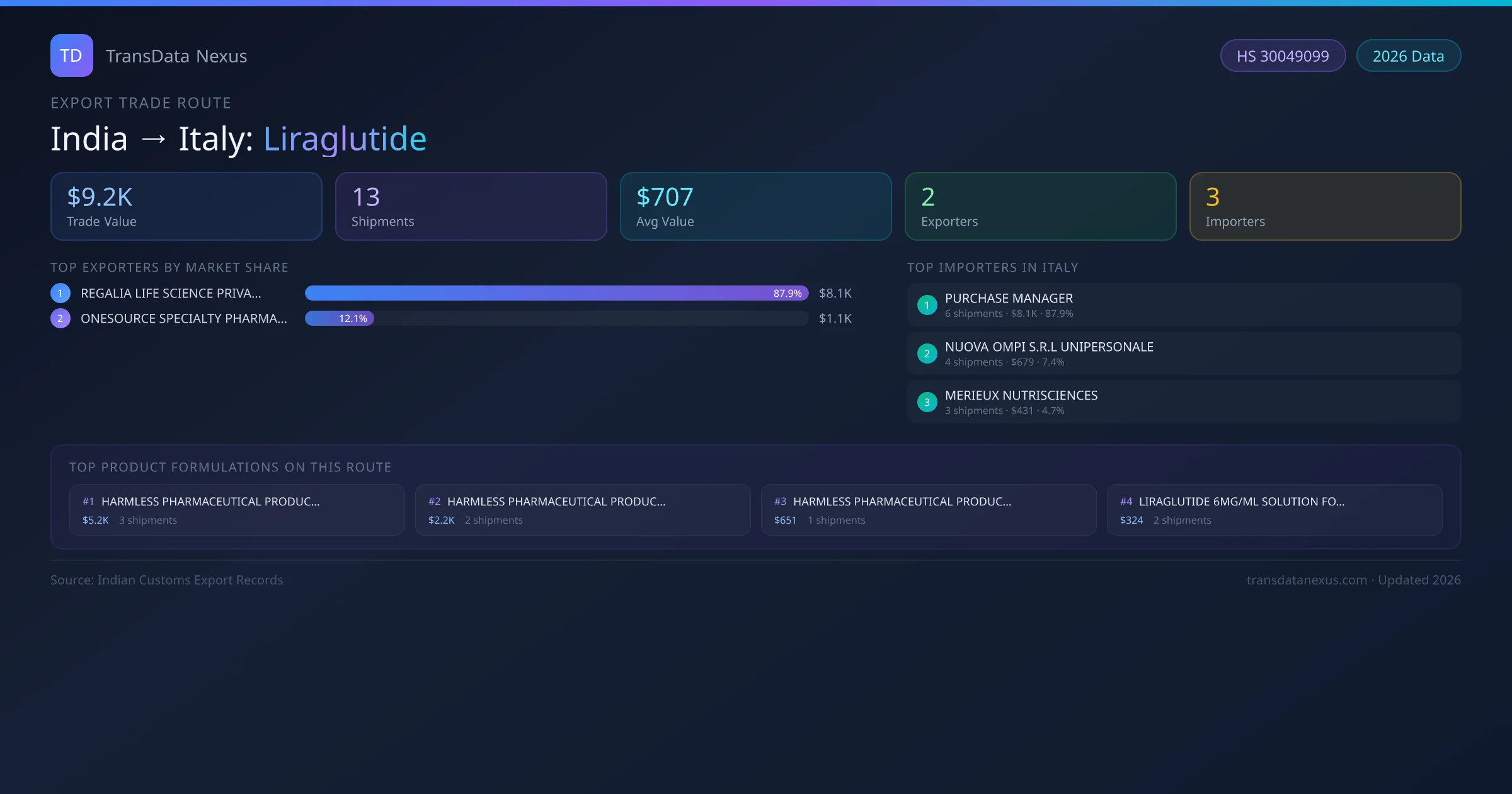India exports Liraglutide to Italy worth approximately $9.2K USD across 13 recorded shipments. The average value per shipment is $707 USD.