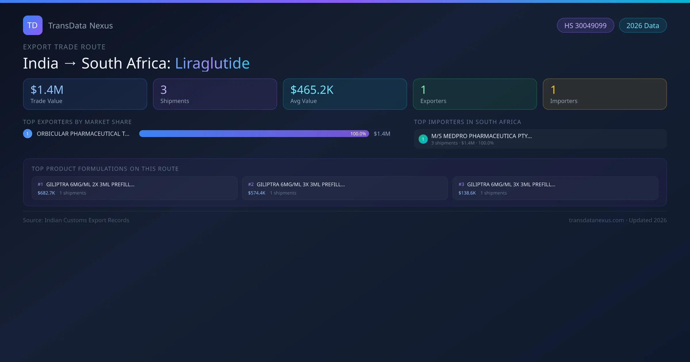 The India to South Africa Liraglutide corridor is one of India's established pharmaceutical export routes, with 3 shipments documented worth a combined $1.4M USD. The route is dominated by ORBICULAR PHARMACEUTICAL TECHNOLOGIES PRIVATE LIMI, which alone accounts for roughly 100% of all export value, reflecting the consolidated nature of India's liraglutide manufacturing sector.