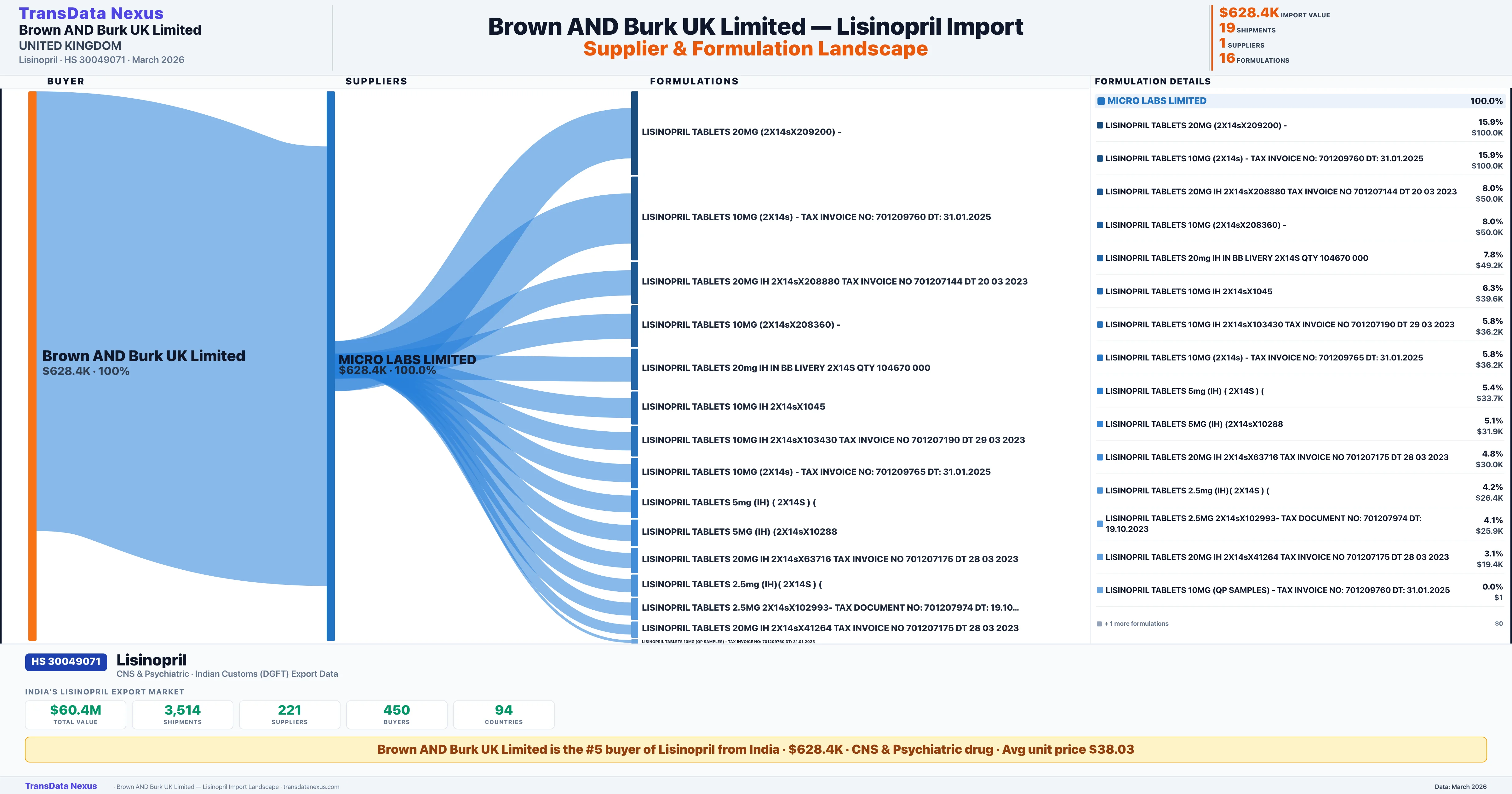 BROWN AND BURK UK LIMITED sources Lisinopril from 1 verified Indian supplier: MICRO LABS LIMITED ($628.4K, 100.0%). This is based on 19 customs records.