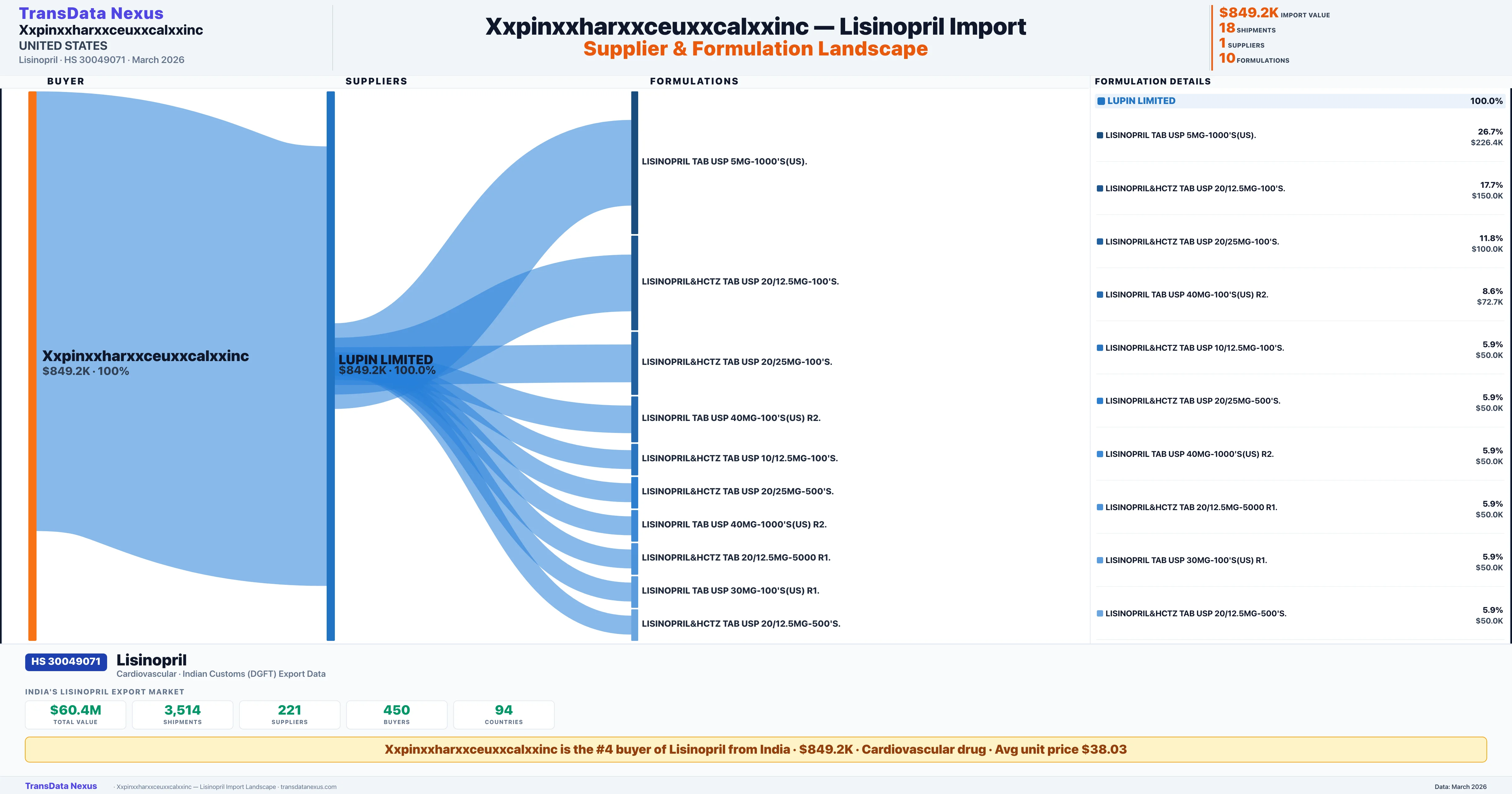XXPINXXHARXXCEUXXCALXXINC sources Lisinopril from 1 verified Indian supplier based on 18 customs records. The primary supplier is LUPIN LIMITED accounting for 100.0% of imports.