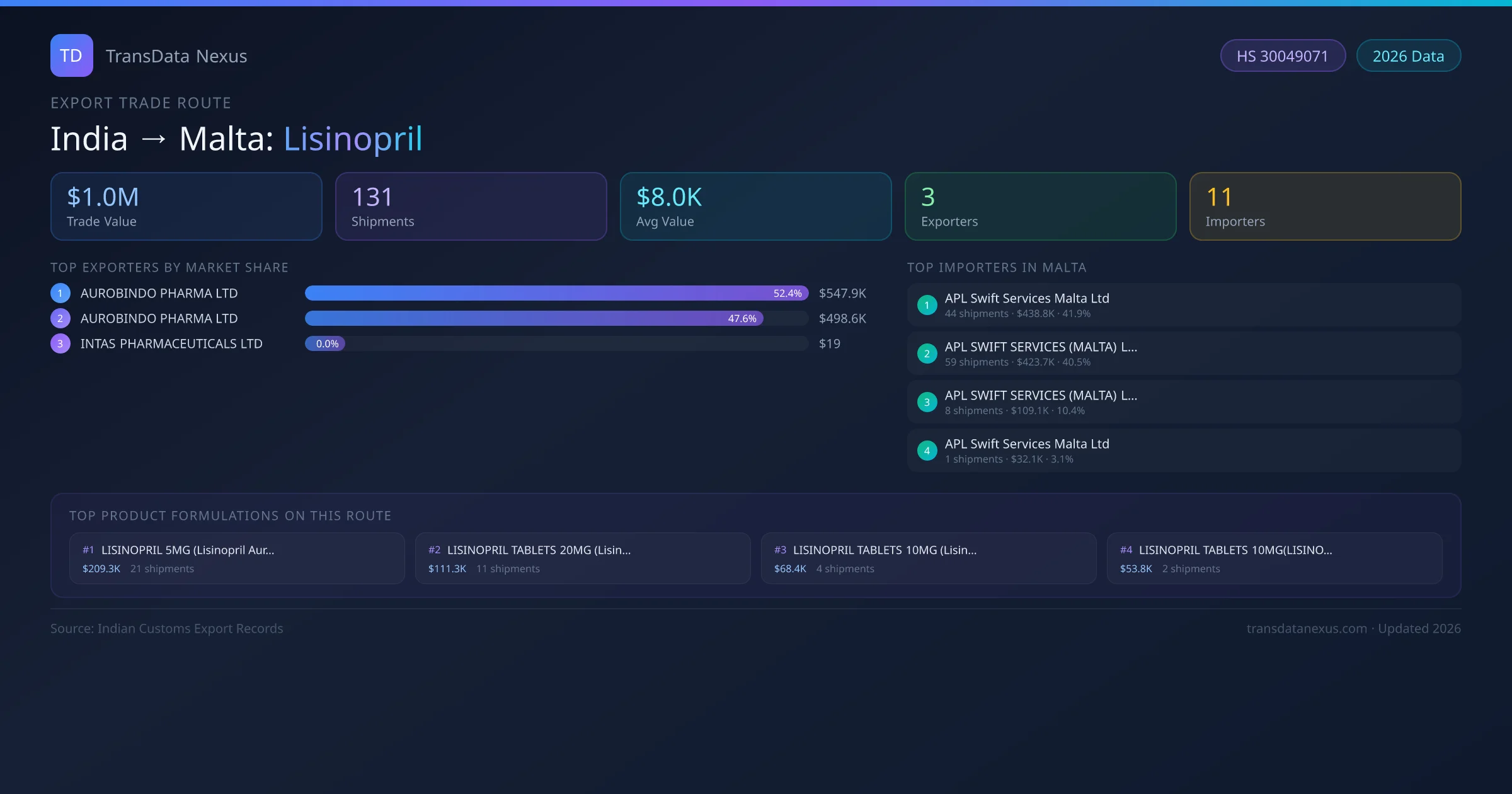 India exports Lisinopril to Malta worth approximately $1.0M USD across 131 recorded shipments. The average value per shipment is $8.0K USD.