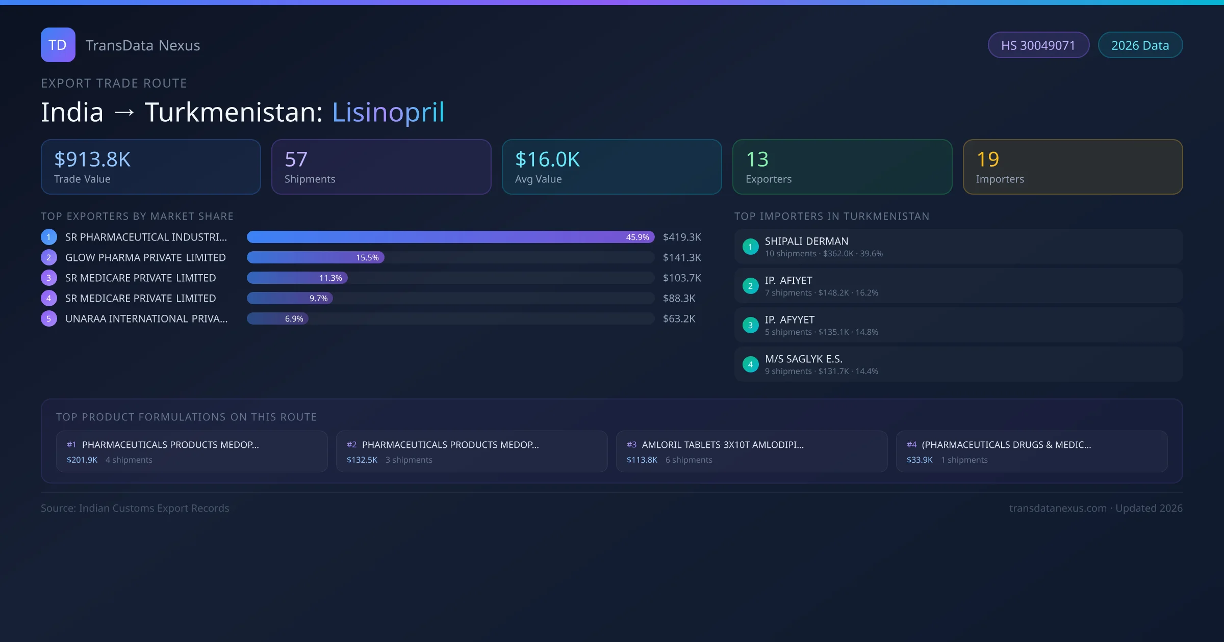 - 1.Route Identification: India to Turkmenistan export trade corridor identified from Indian Customs (DGFT) records for Lisinopril.