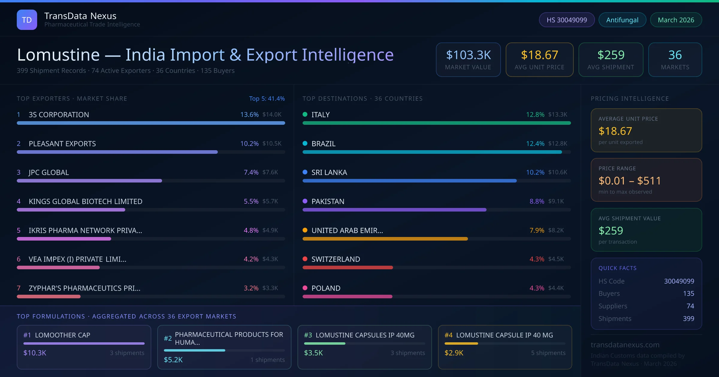 Between 2022 and 2026, India exported $103.3K worth of lomustine across 399 verified shipments to 36 countries — covering 18% of world markets in the Advanced Oncology segment. The largest destination is ITALY (12.8%). 3S CORPORATION leads with a 13.6% share. All figures are drawn from Indian Customs (DGFT) shipping bill records spanning four years of trade activity.