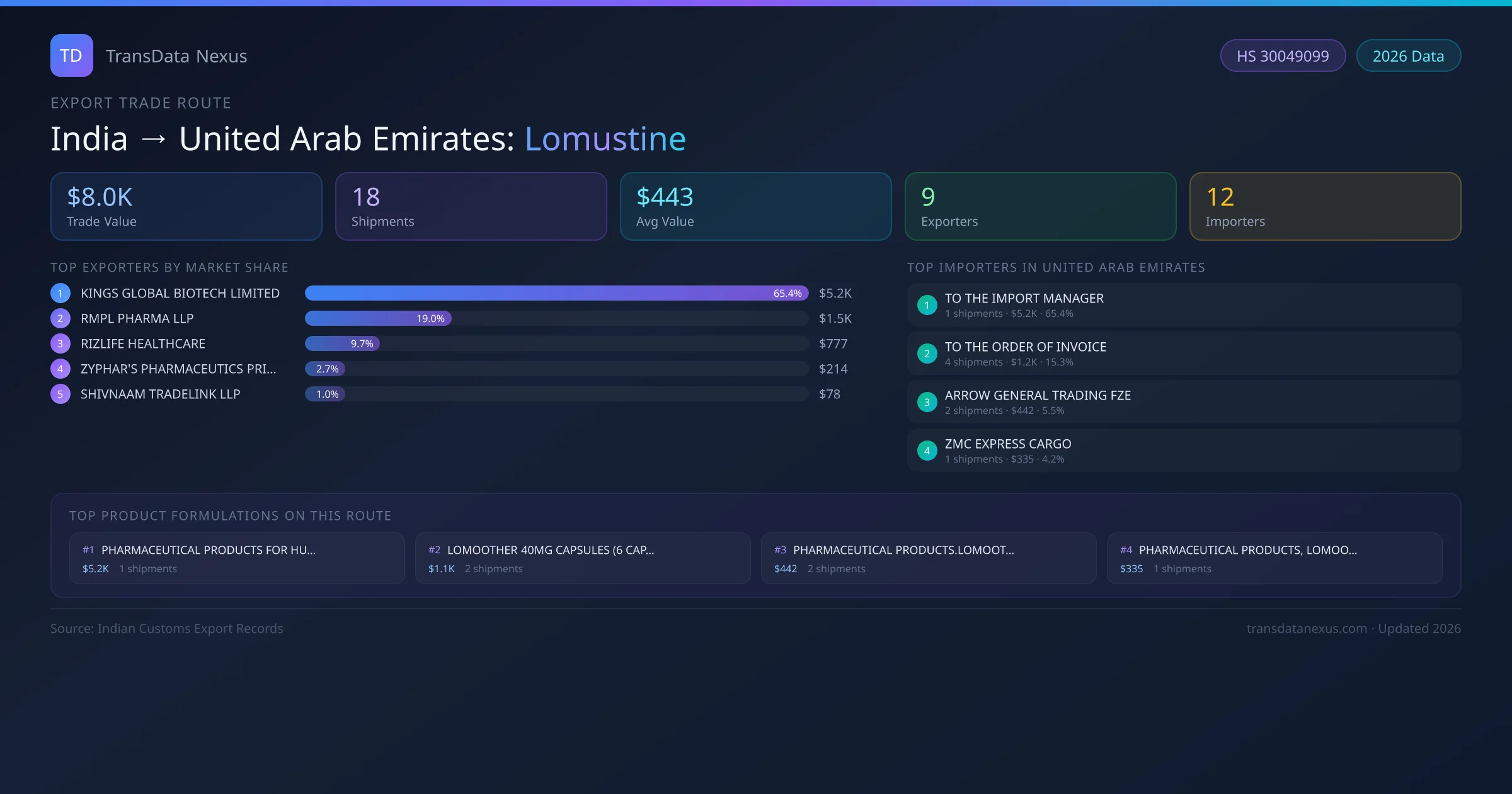India has recorded 18 verified shipments of Lomustine exported to United Arab Emirates, representing a combined trade value of $8.0K USD. This corridor is served by 9 active Indian exporters, with an average shipment value of $443 USD. The leading Indian exporter is KINGS GLOBAL BIOTECH LIMITED, which accounts for 65% of total export value with 1 shipments worth $5.2K USD. On the buying side, TO THE IMPORT MANAGER is the largest importer in United Arab Emirates with $5.2K USD in purchases. The top 3 suppliers — KINGS GLOBAL BIOTECH LIMITED, RMPL PHARMA LLP, RIZLIFE HEALTHCARE — together control 94% of total trade value on this route. All data sourced from Indian Customs (DGFT) shipping bill records. Values reported in FOB USD.