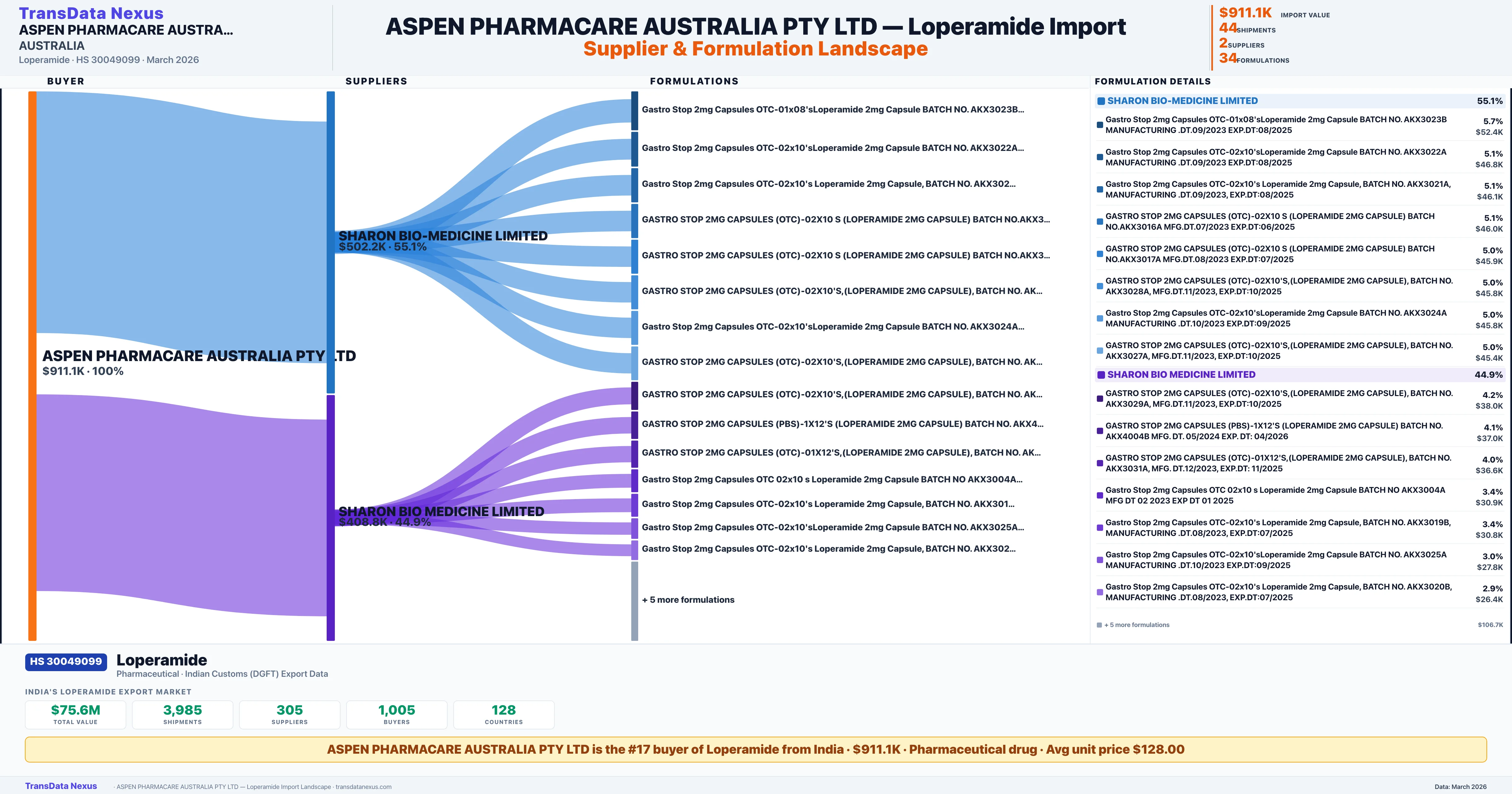 ASPEN PHARMACARE AUSTRALIA PTY LTD sources Loperamide from 2 verified Indian suppliers: SHARON BIO-MEDICINE LIMITED ($502.2K, 55.1%), SHARON BIO MEDICINE LIMITED ($408.8K, 44.9%). This is based on 44 customs records.