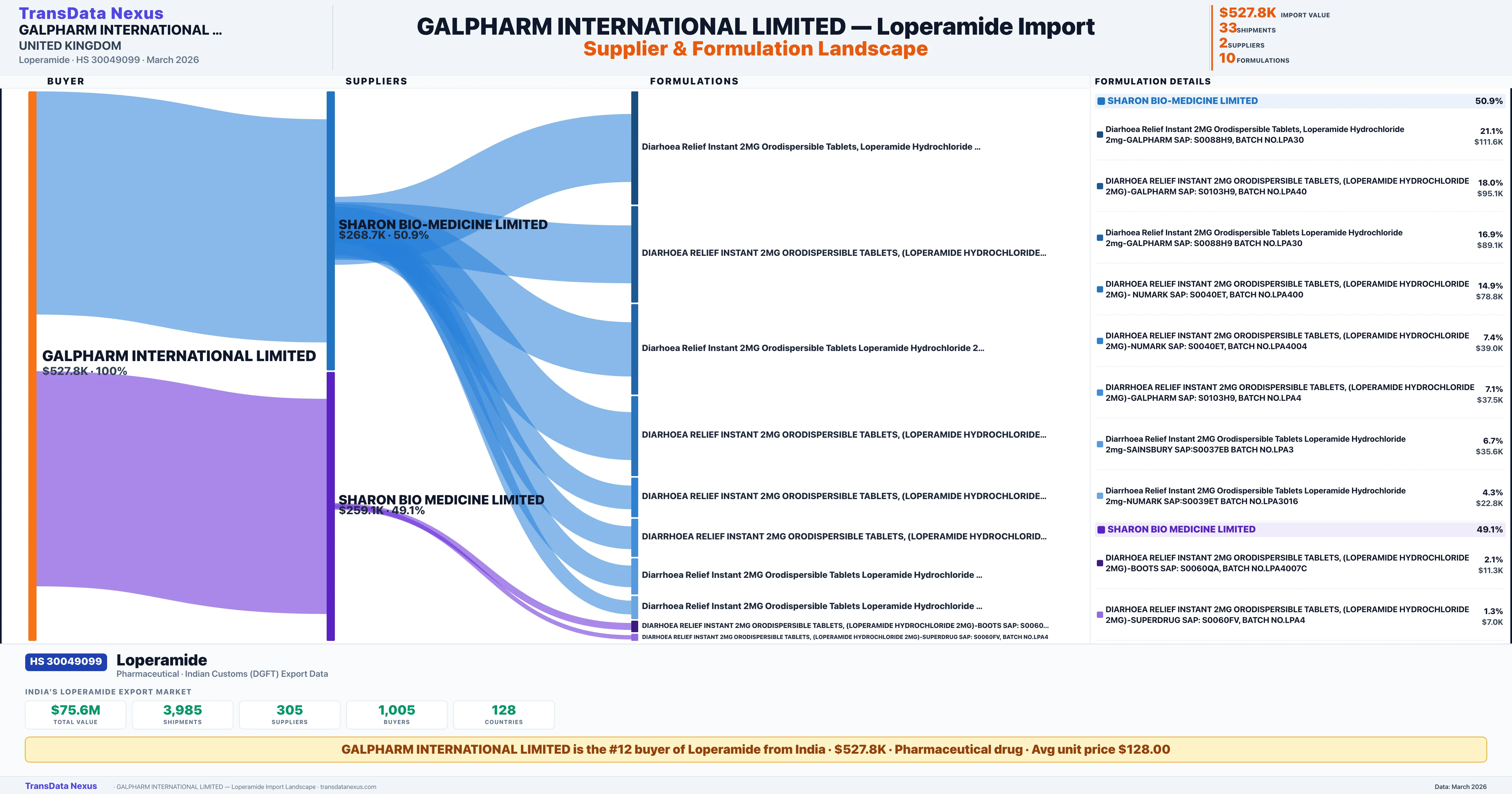 GALPHARM INTERNATIONAL LIMITED sources Loperamide from 2 verified Indian suppliers: SHARON BIO-MEDICINE LIMITED ($268.7K, 50.9%), SHARON BIO MEDICINE LIMITED ($259.1K, 49.1%). This is based on 33 customs records.