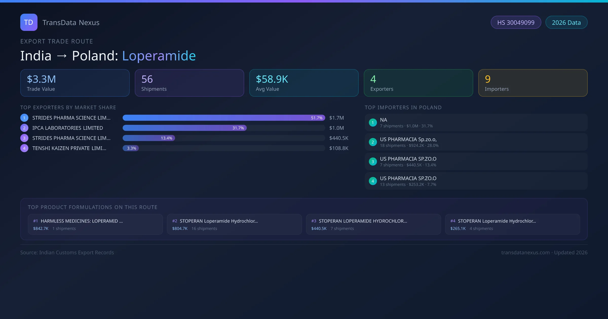 - 1.Route Identification: India to Poland export trade corridor identified from Indian Customs (DGFT) records for Loperamide.