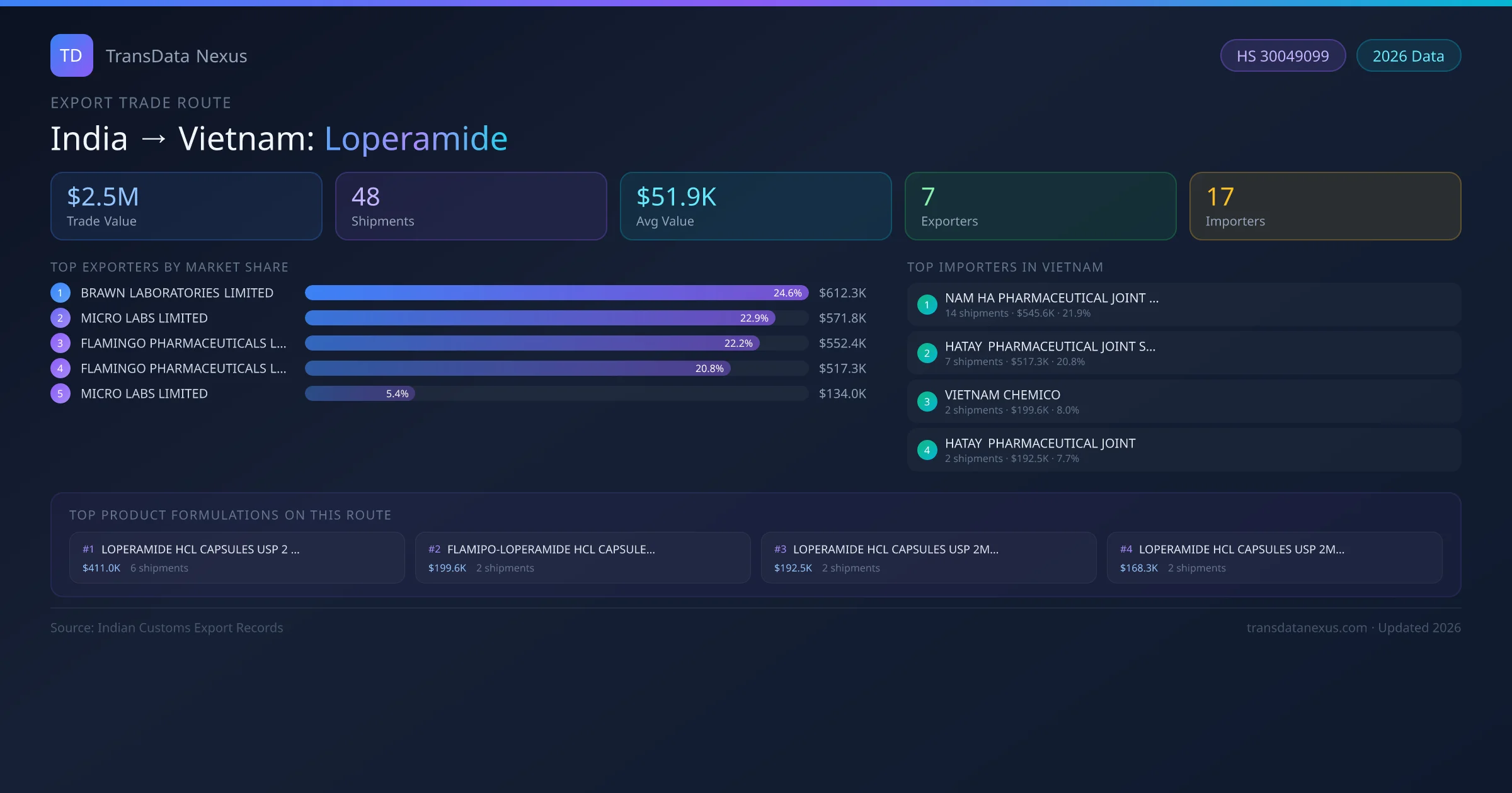 The leading Indian exporters of Loperamide to Vietnam are BRAWN LABORATORIES LIMITED, MICRO LABS LIMITED, FLAMINGO PHARMACEUTICALS LIMITED. BRAWN LABORATORIES LIMITED holds the largest market share at approximately 25% of total trade value on this route.