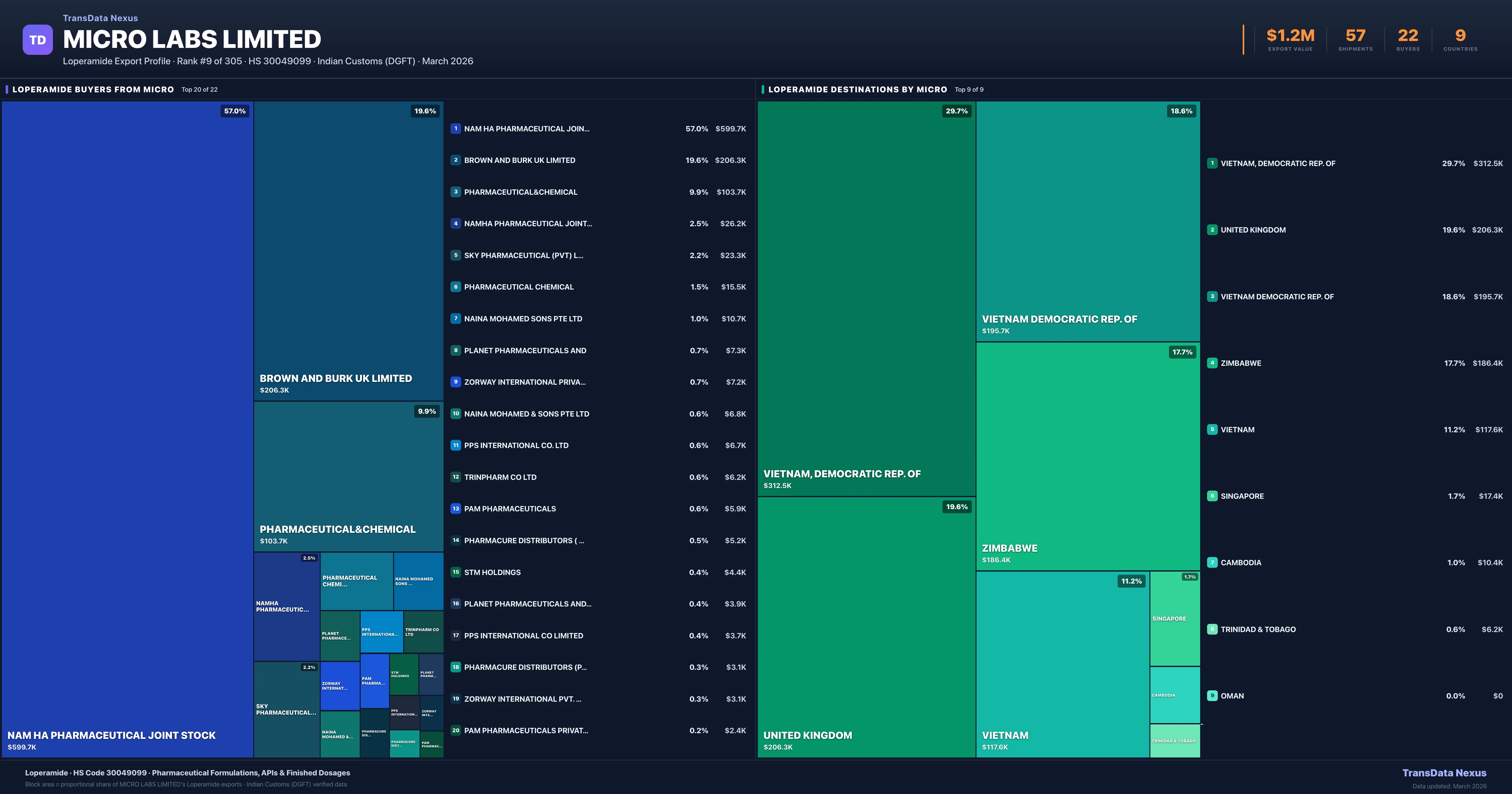 - 4.Verified Records: This page is backed by 57 individual customs records matching Micro Labs Limited exporting Loperamide, covering 40 formulations to 9 countries via 22 buyers.