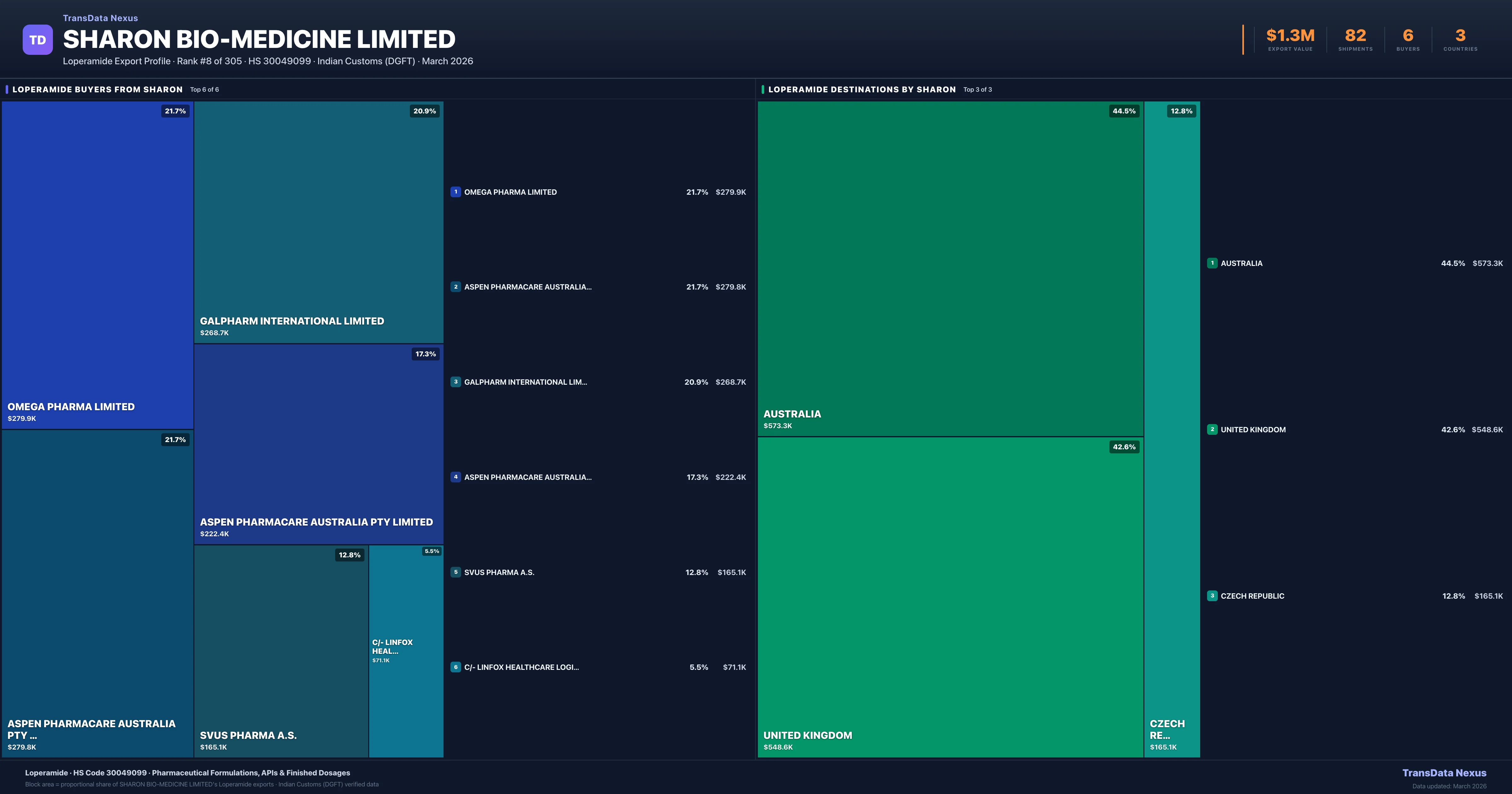 - 4.Verified Records: This page is backed by 82 individual customs records matching Sharon Bio-medicine Limited exporting Loperamide, covering 45 formulations to 3 countries via 6 buyers.