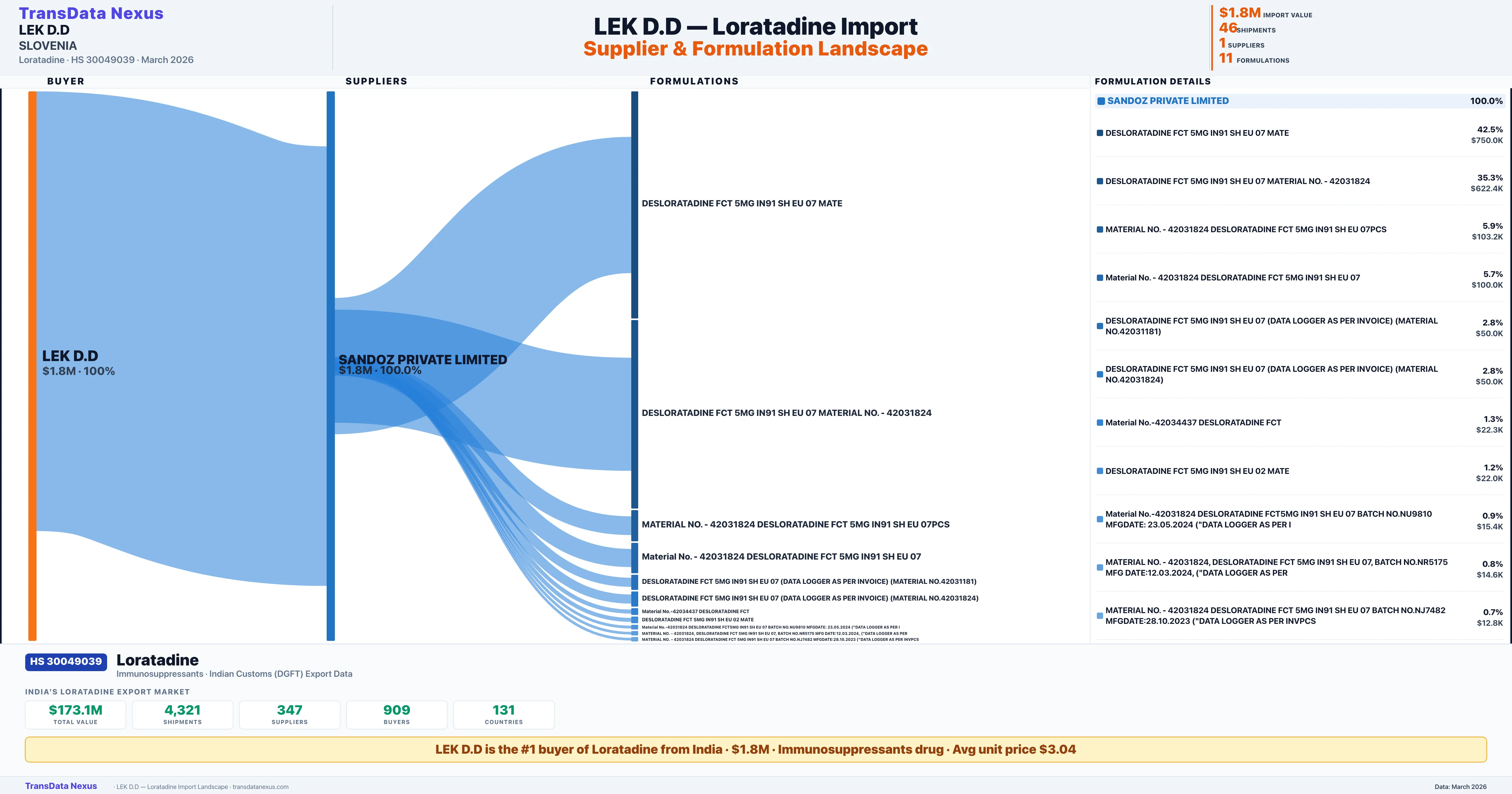 LEK D.D sources Loratadine from 1 verified Indian supplier: SANDOZ PRIVATE LIMITED ($1.8M, 100.0%). This is based on 46 customs records.