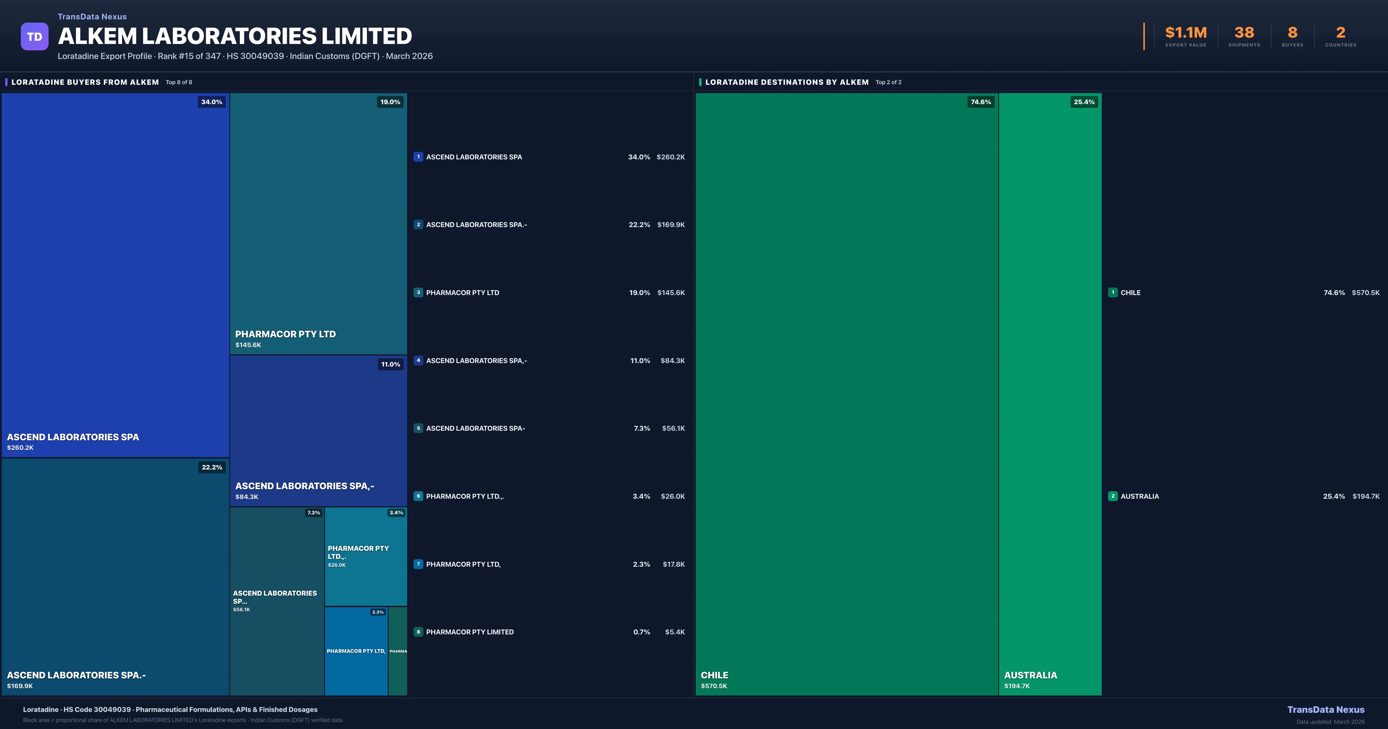 Alkem Laboratories Limited supplies Loratadine to 8 buyers globally. The largest buyer is ASCEND LABORATORIES SPA (CHILE), followed by ASCEND LABORATORIES SPA.- (CHILE) and PHARMACOR PTY LTD (AUSTRALIA). These buyers represent pharmaceutical distributors, hospital groups, and government procurement agencies in their respective markets.