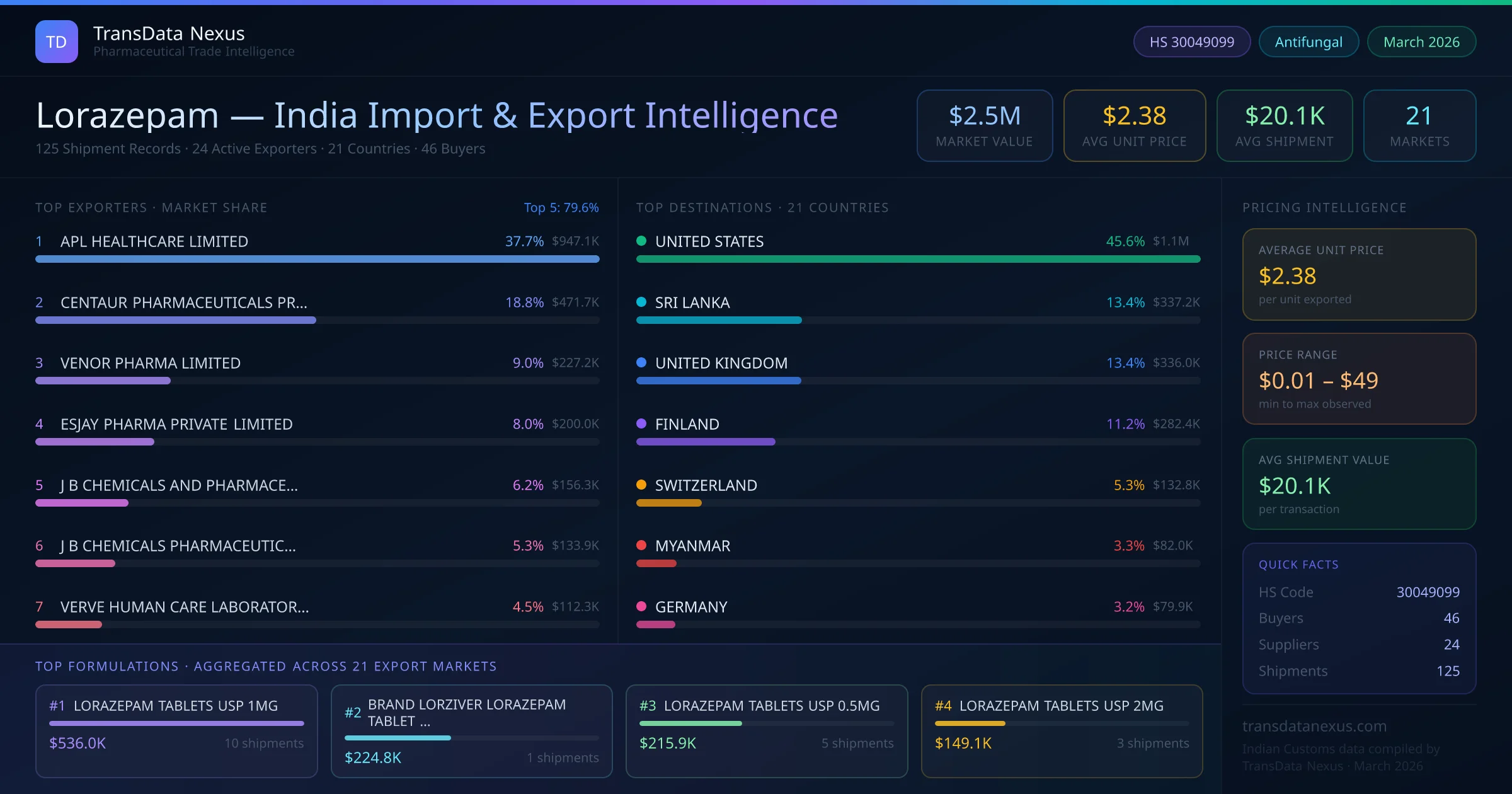 Between 2022 and 2026, India exported $2.5M worth of lorazepam across 125 verified shipments to 21 countries — covering 11% of world markets in the CNS & Psychiatric segment. The largest destination is UNITED STATES (45.6%). APL HEALTHCARE LIMITED leads with a 37.7% share. All figures are drawn from Indian Customs (DGFT) shipping bill records spanning four years of trade activity.