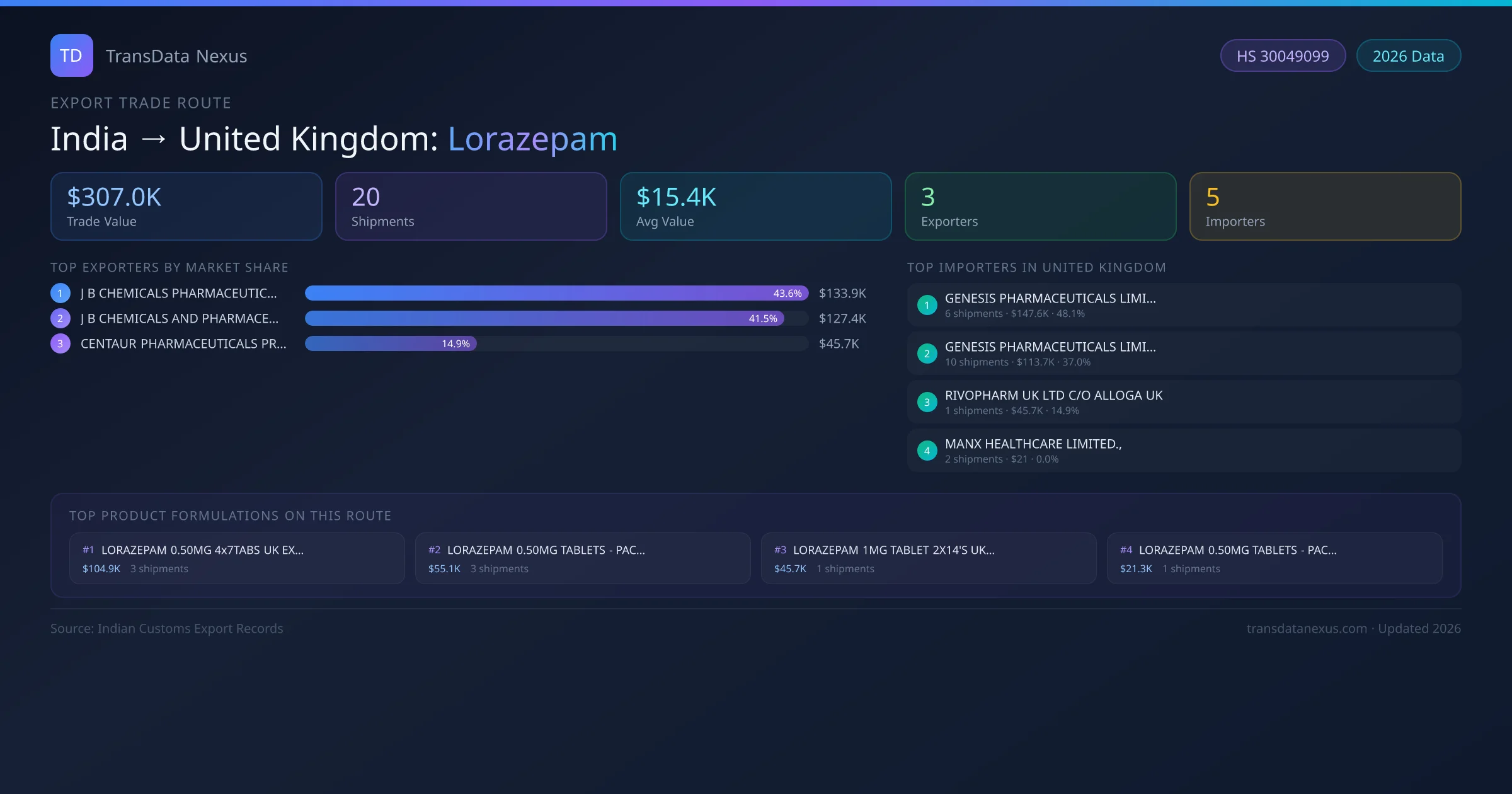 The India to United Kingdom Lorazepam corridor is one of India's established pharmaceutical export routes, with 20 shipments documented worth a combined $307.0K USD. The route is dominated by J B CHEMICALS PHARMACEUTICALS LIMITED, which alone accounts for roughly 44% of all export value, reflecting the consolidated nature of India's lorazepam manufacturing sector.