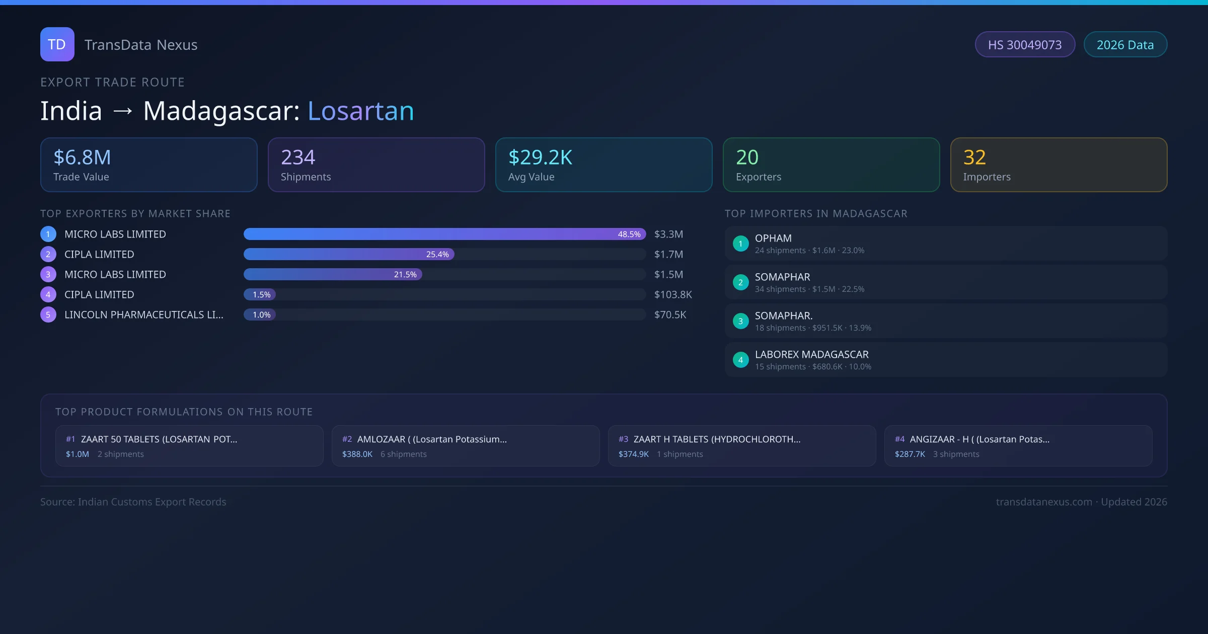 India has recorded 234 verified shipments of Losartan exported to Madagascar, representing a combined trade value of $6.8M USD. This corridor is served by 20 active Indian exporters, with an average shipment value of $29.2K USD. The leading Indian exporter is MICRO LABS LIMITED, which accounts for 48% of total export value with 110 shipments worth $3.3M USD. On the buying side, OPHAM is the largest importer in Madagascar with $1.6M USD in purchases. The top 3 suppliers — MICRO LABS LIMITED, CIPLA LIMITED, MICRO LABS LIMITED — together control 95% of total trade value on this route. All data sourced from Indian Customs (DGFT) shipping bill records. Values reported in FOB USD.
