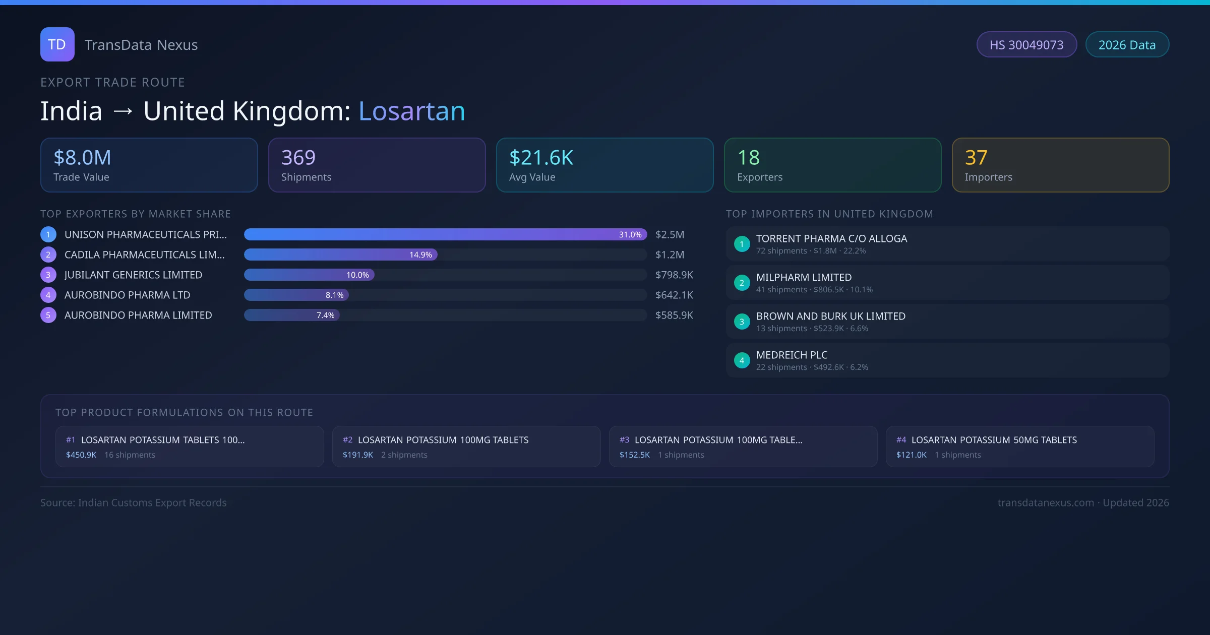 India has recorded 369 verified shipments of Losartan exported to United Kingdom, representing a combined trade value of $8.0M USD. This corridor is served by 18 active Indian exporters, with an average shipment value of $21.6K USD. The leading Indian exporter is UNISON PHARMACEUTICALS PRIVATE LIMITED, which accounts for 31% of total export value with 92 shipments worth $2.5M USD. On the buying side, TORRENT PHARMA C/O ALLOGA is the largest importer in United Kingdom with $1.8M USD in purchases. The top 3 suppliers — UNISON PHARMACEUTICALS PRIVATE LIMITED, CADILA PHARMACEUTICALS LIMITED, JUBILANT GENERICS LIMITED — together control 56% of total trade value on this route. All data sourced from Indian Customs (DGFT) shipping bill records. Values reported in FOB USD.