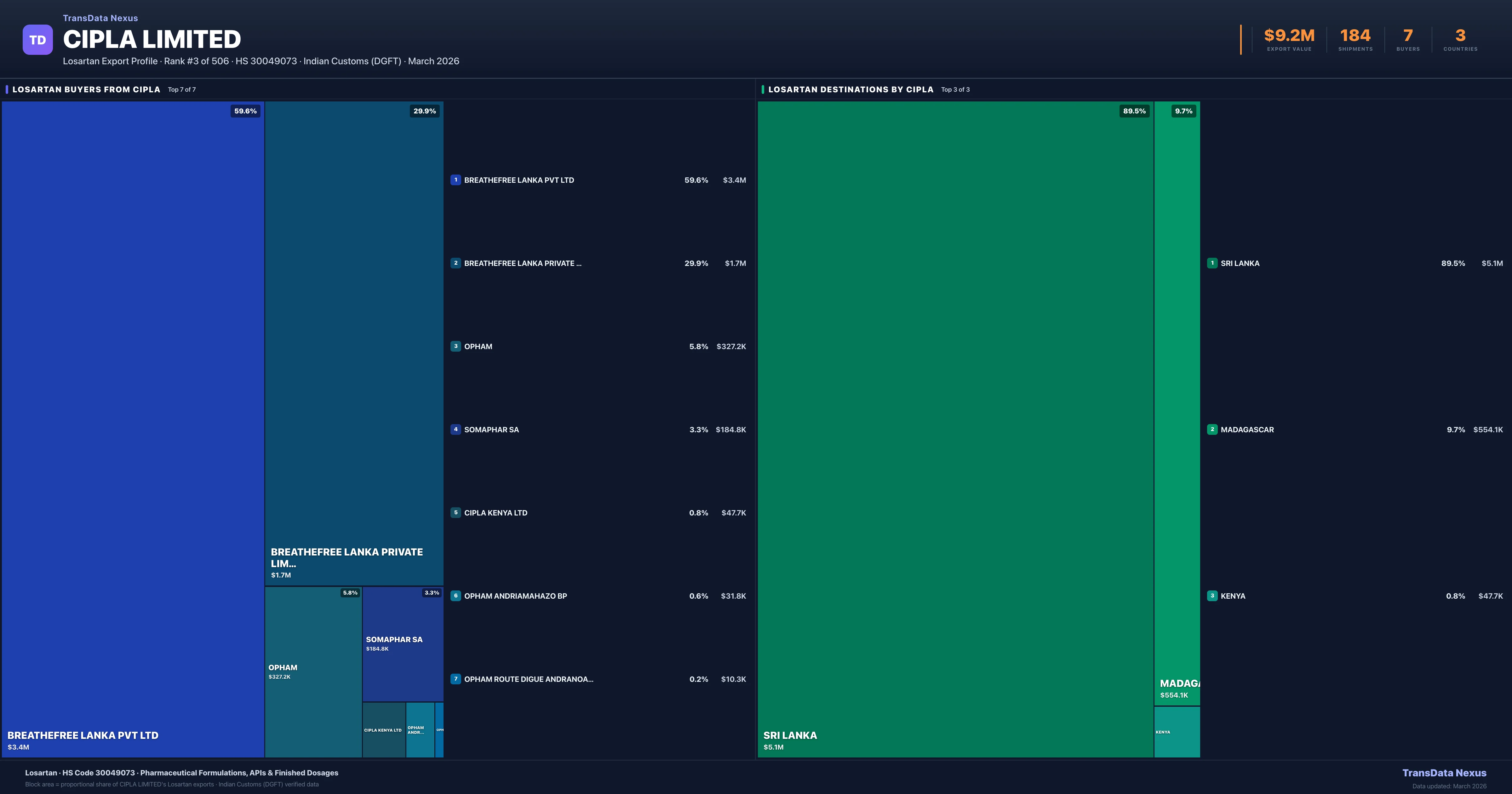 - 4.Verified Records: This page is backed by 184 individual customs records matching Cipla Limited exporting Losartan, covering 114 formulations to 3 countries via 7 buyers.