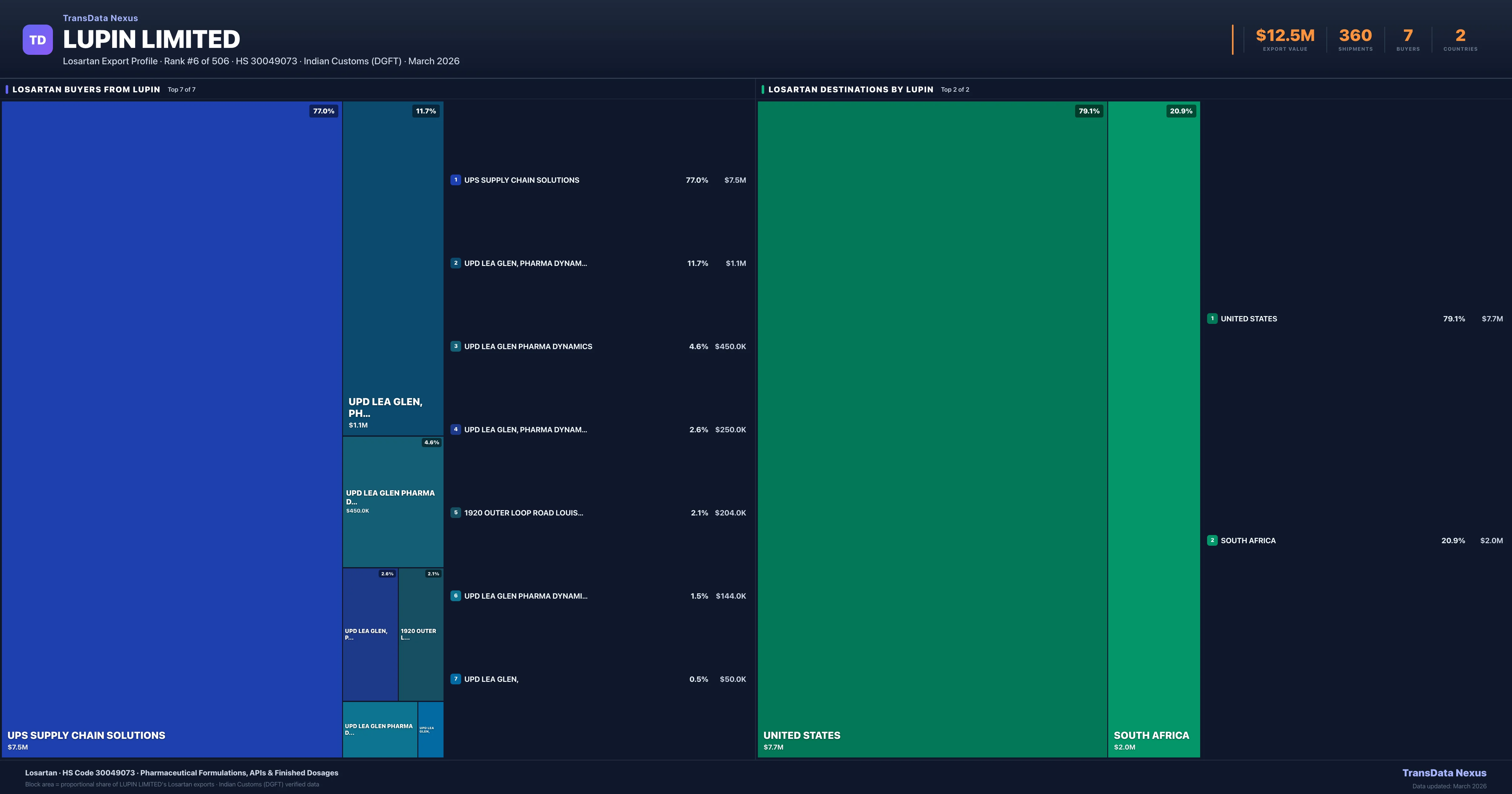 Lupin Limited supplies Losartan to 7 buyers globally. The largest buyer is UPS SUPPLY CHAIN SOLUTIONS (UNITED STATES), followed by UPD LEA GLEN, PHARMA DYNAMICS C/O (SOUTH AFRICA) and UPD LEA GLEN PHARMA DYNAMICS (SOUTH AFRICA). These buyers represent pharmaceutical distributors, hospital groups, and government procurement agencies in their respective markets.