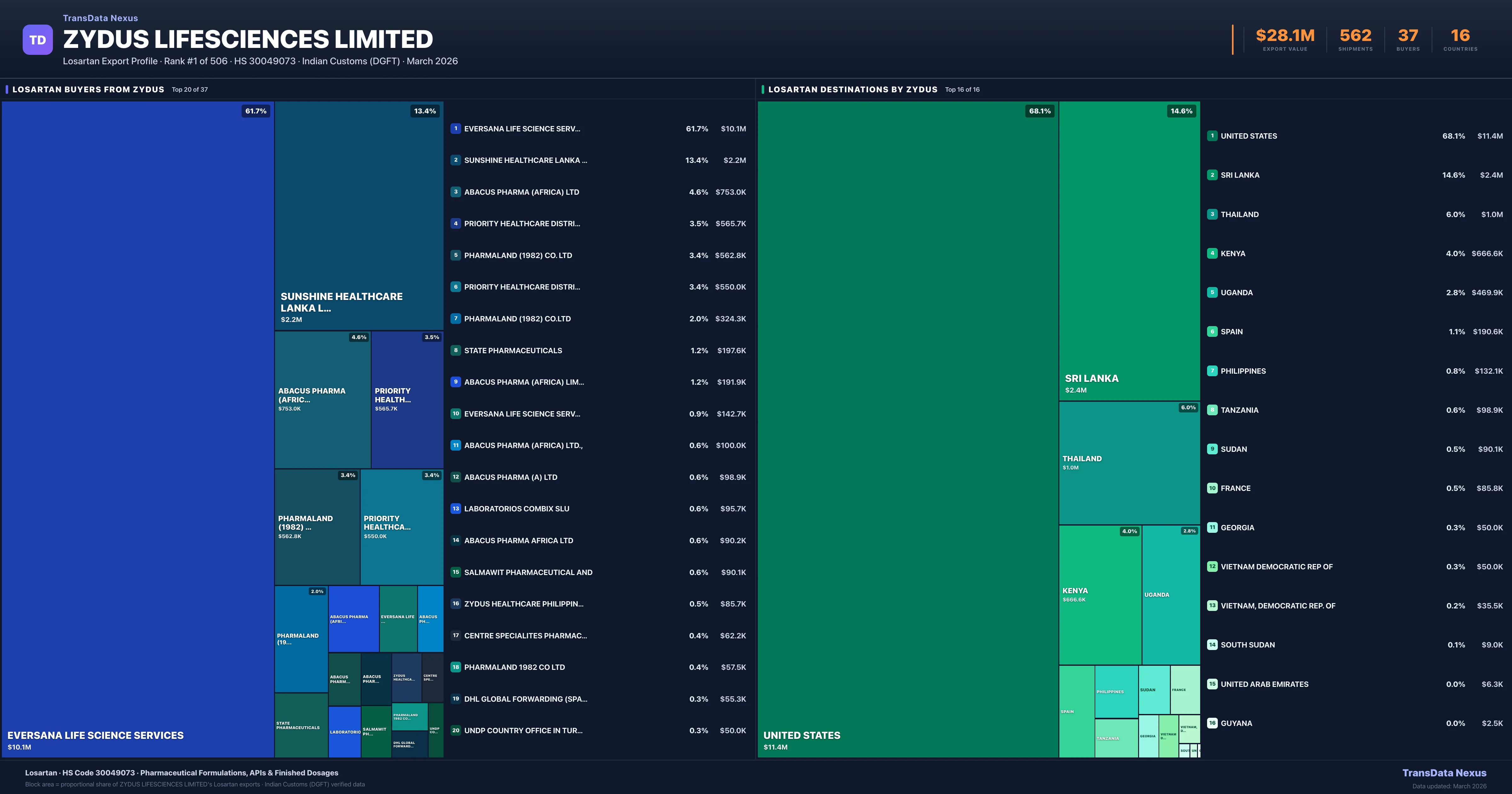 Zydus Lifesciences Limited supplies Losartan to 37 buyers globally. The largest buyer is EVERSANA LIFE SCIENCE SERVICES (UNITED STATES), followed by SUNSHINE HEALTHCARE LANKA LIMITED (SRI LANKA) and ABACUS PHARMA (AFRICA) LTD (UGANDA). These buyers represent pharmaceutical distributors, hospital groups, and government procurement agencies in their respective markets.