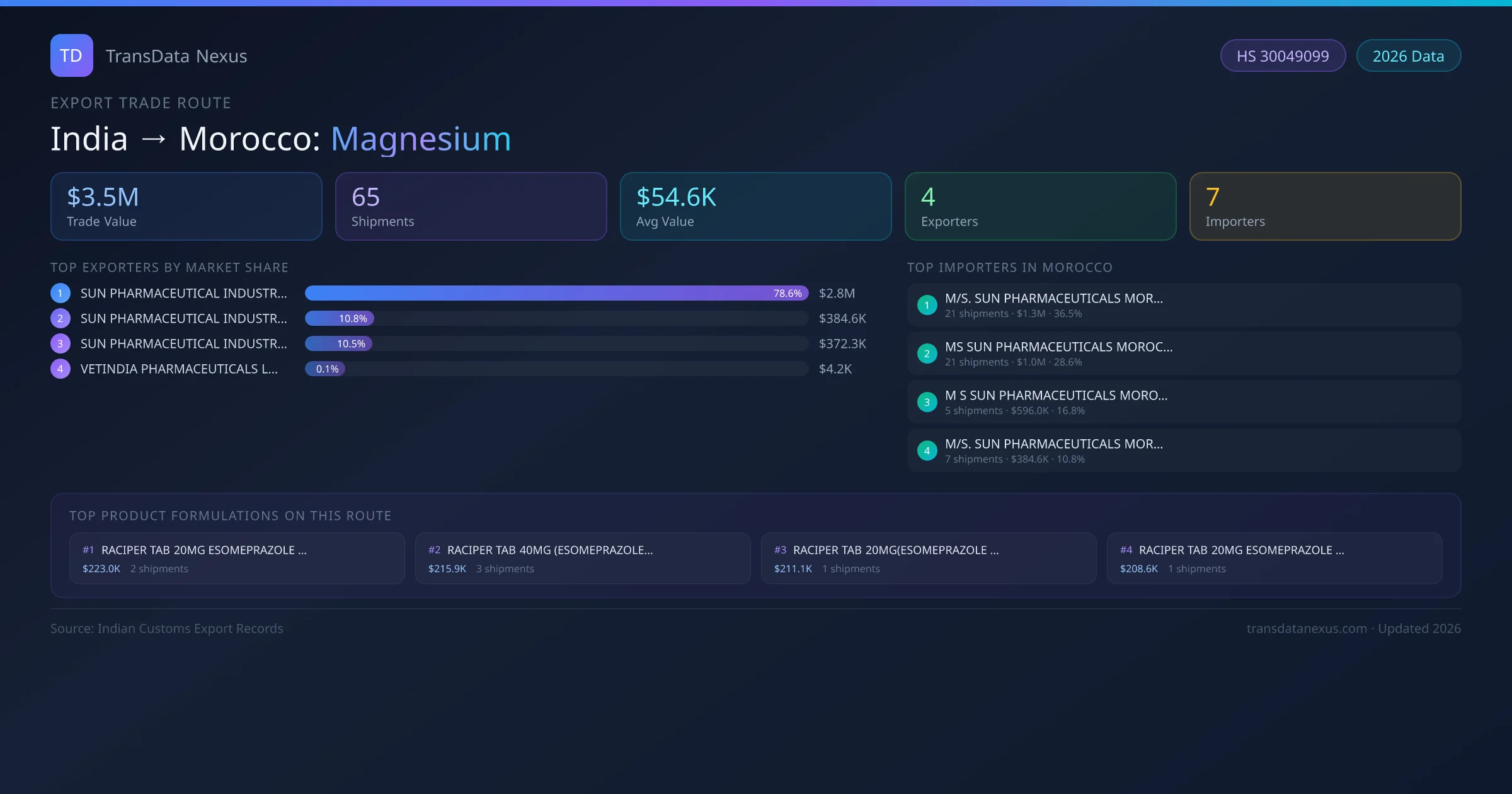 India has recorded 65 verified shipments of Magnesium exported to Morocco, representing a combined trade value of $3.5M USD. This corridor is served by 4 active Indian exporters, with an average shipment value of $54.6K USD. The leading Indian exporter is SUN PHARMACEUTICAL INDUSTRIES LIMITED, which accounts for 79% of total export value with 49 shipments worth $2.8M USD. On the buying side, M/S. SUN PHARMACEUTICALS MOROCCO LL is the largest importer in Morocco with $1.3M USD in purchases. The top 3 suppliers — SUN PHARMACEUTICAL INDUSTRIES LIMITED, SUN PHARMACEUTICAL INDUSTRIES LIMITED , SUN PHARMACEUTICAL INDUSTRIES LTD — together control 100% of total trade value on this route. All data sourced from Indian Customs (DGFT) shipping bill records. Values reported in FOB USD.