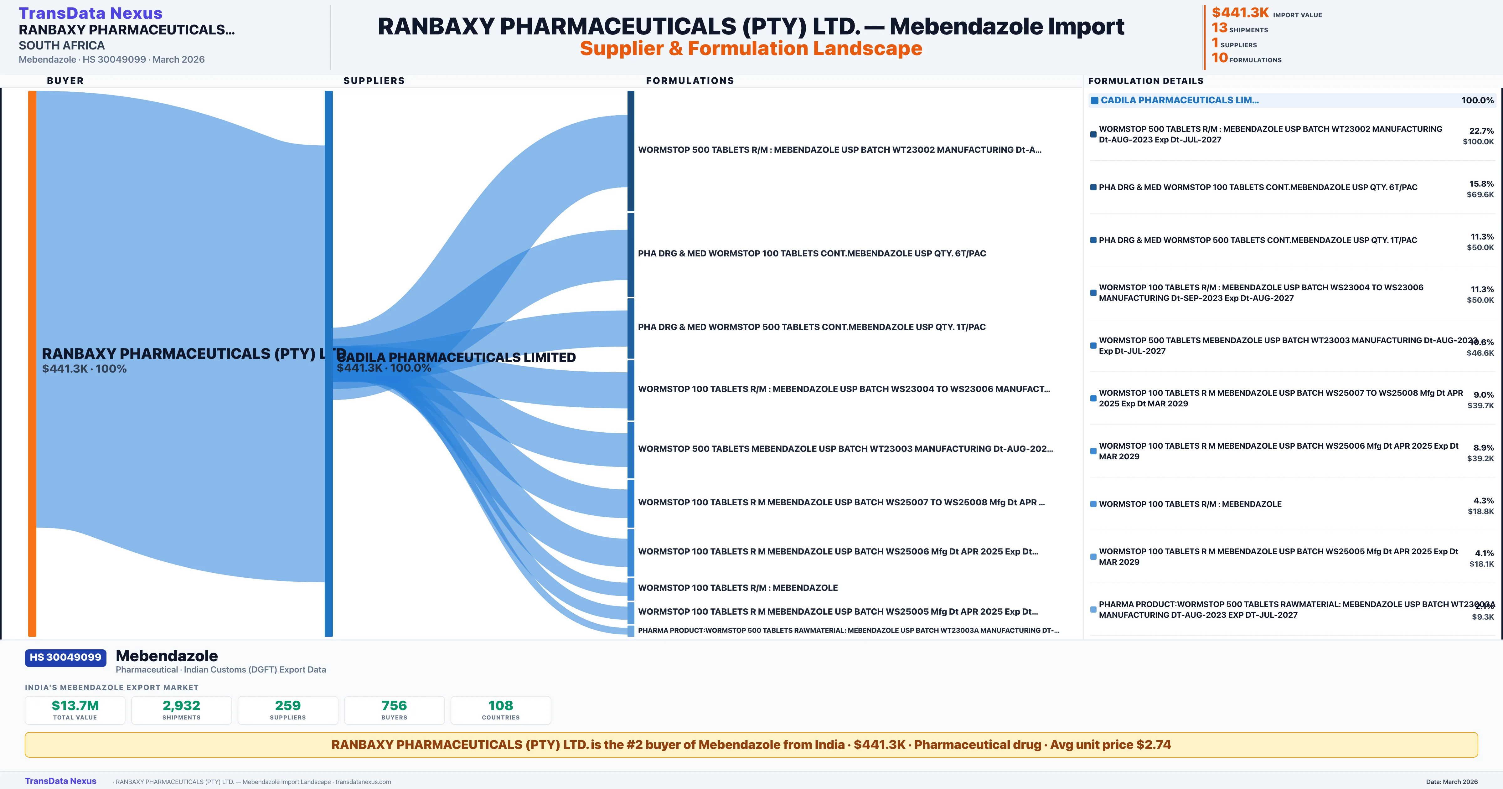 RANBAXY PHARMACEUTICALS (PTY) LTD. sources Mebendazole from 1 verified Indian supplier: CADILA PHARMACEUTICALS LIMITED ($441.3K, 100.0%). This is based on 13 customs records.