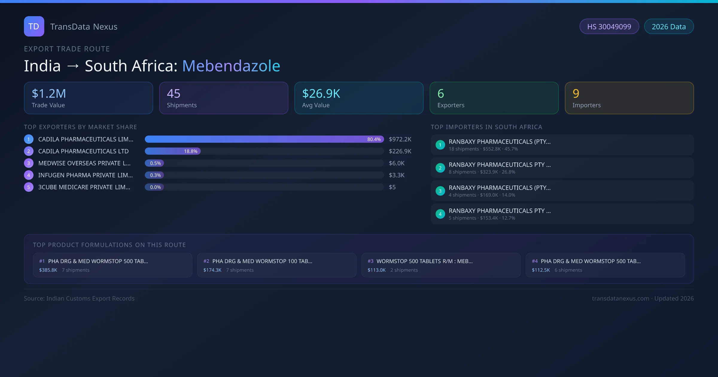 India has recorded 45 verified shipments of Mebendazole exported to South Africa, representing a combined trade value of $1.2M USD. This corridor is served by 6 active Indian exporters, with an average shipment value of $26.9K USD. The leading Indian exporter is CADILA PHARMACEUTICALS LIMITED, which accounts for 80% of total export value with 31 shipments worth $972.2K USD. On the buying side, RANBAXY PHARMACEUTICALS (PTY) LTD. is the largest importer in South Africa with $552.8K USD in purchases. The top 3 suppliers — CADILA PHARMACEUTICALS LIMITED, CADILA PHARMACEUTICALS LTD, MEDWISE OVERSEAS PRIVATE LIMITED — together control 100% of total trade value on this route. All data sourced from Indian Customs (DGFT) shipping bill records. Values reported in FOB USD.