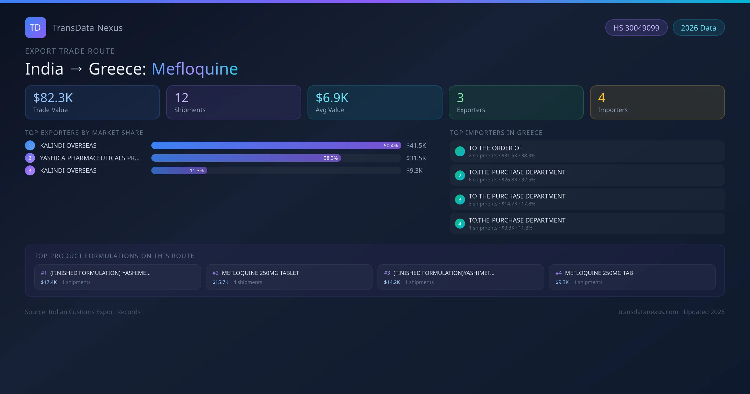 - 1.Route Identification: India to Greece export trade corridor identified from Indian Customs (DGFT) records for Mefloquine.
