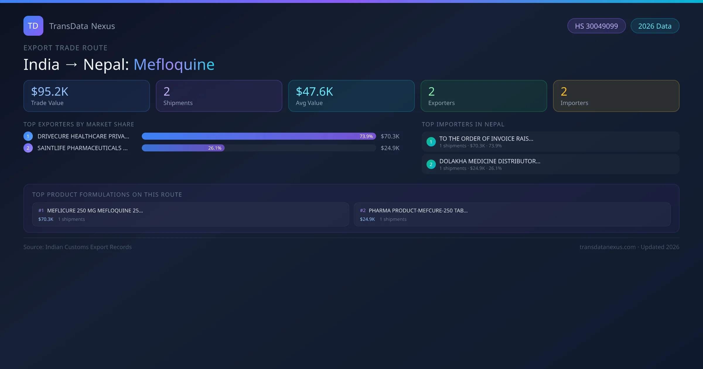 The India to Nepal Mefloquine corridor is one of India's established pharmaceutical export routes, with 2 shipments documented worth a combined $95.2K USD. The route is dominated by DRIVECURE HEALTHCARE PRIVATE LIMITED, which alone accounts for roughly 74% of all export value, reflecting the consolidated nature of India's mefloquine manufacturing sector.