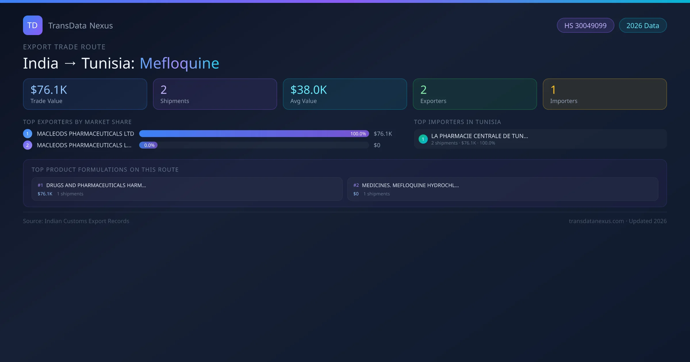 The India to Tunisia Mefloquine corridor is one of India's established pharmaceutical export routes, with 2 shipments documented worth a combined $76.1K USD. The route is dominated by MACLEODS PHARMACEUTICALS LTD, which alone accounts for roughly 100% of all export value, reflecting the consolidated nature of India's mefloquine manufacturing sector.