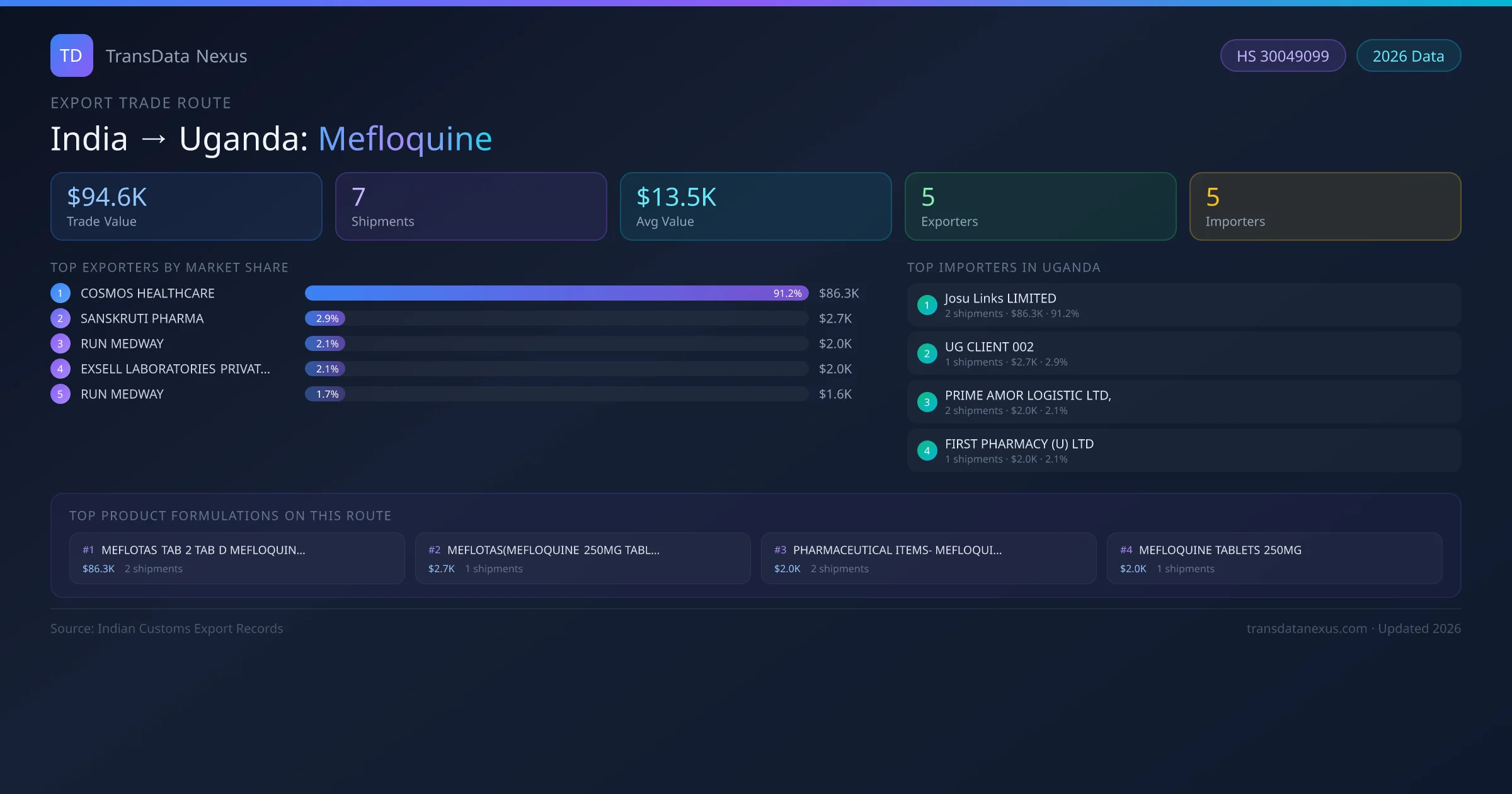 The India to Uganda Mefloquine corridor is one of India's established pharmaceutical export routes, with 7 shipments documented worth a combined $94.6K USD. The route is dominated by COSMOS HEALTHCARE, which alone accounts for roughly 91% of all export value, reflecting the consolidated nature of India's mefloquine manufacturing sector.