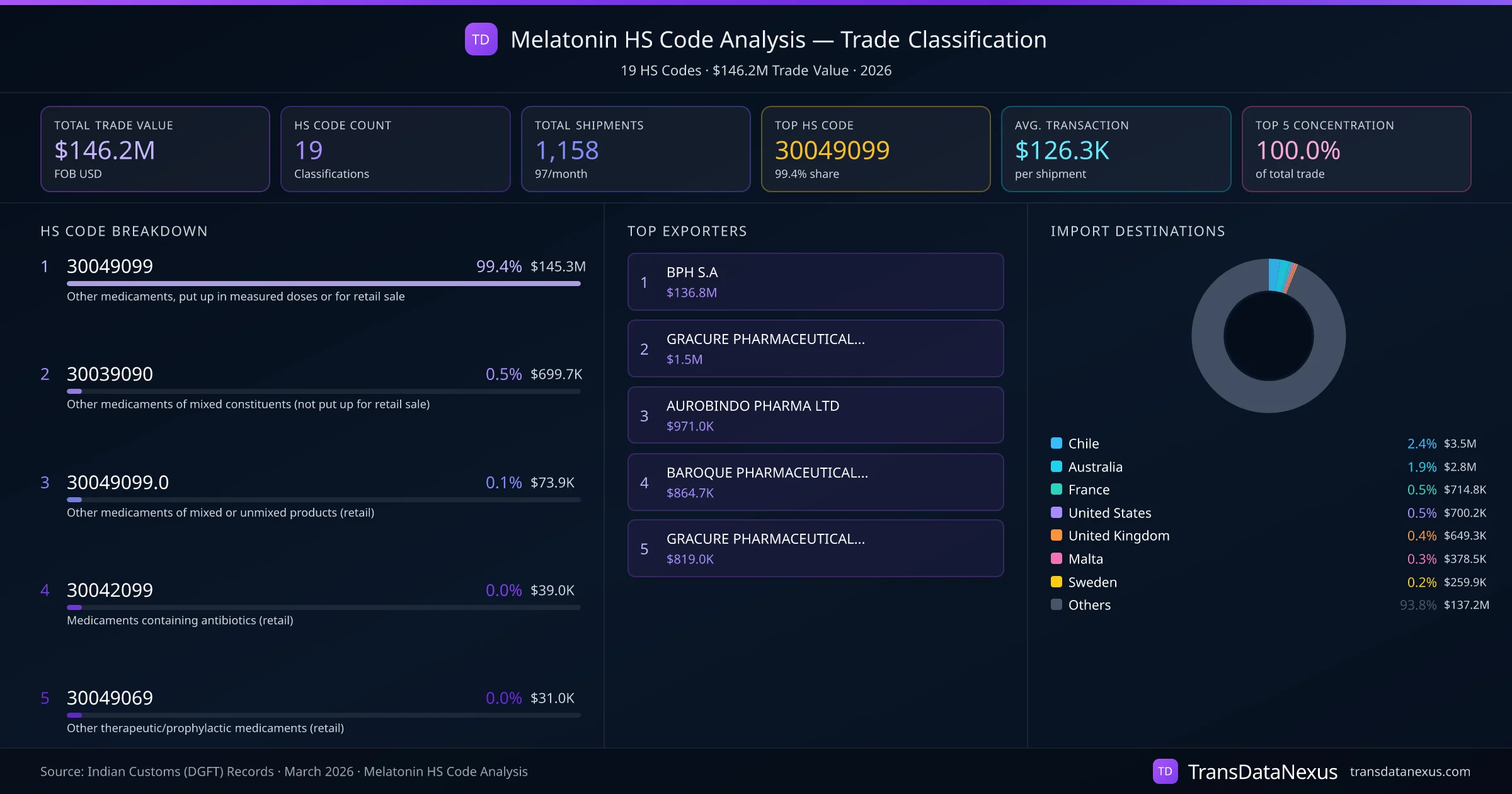 India exports Melatonin under 19 distinct HS code classifications, representing a total trade value of $146.2M across 1,158 shipments. The dominant classification is HS 30049099 (Other medicaments, put up in measured doses or for retail sale), accounting for 99.4% of all Melatonin trade at $145.3M. HS 30039090 (Other medicaments of mixed constituents (not put up for retail sale)) follows at 0.5% ($699.7K). The top 5 HS codes together account for 100.0% of total Melatonin trade from India. The average transaction value is $126251. Key importing markets include Chile, Australia, France. Leading exporters include BPH S.A and GRACURE PHARMACEUTICALS LIMITED. Data sourced from Indian Customs (DGFT) shipping bill records.