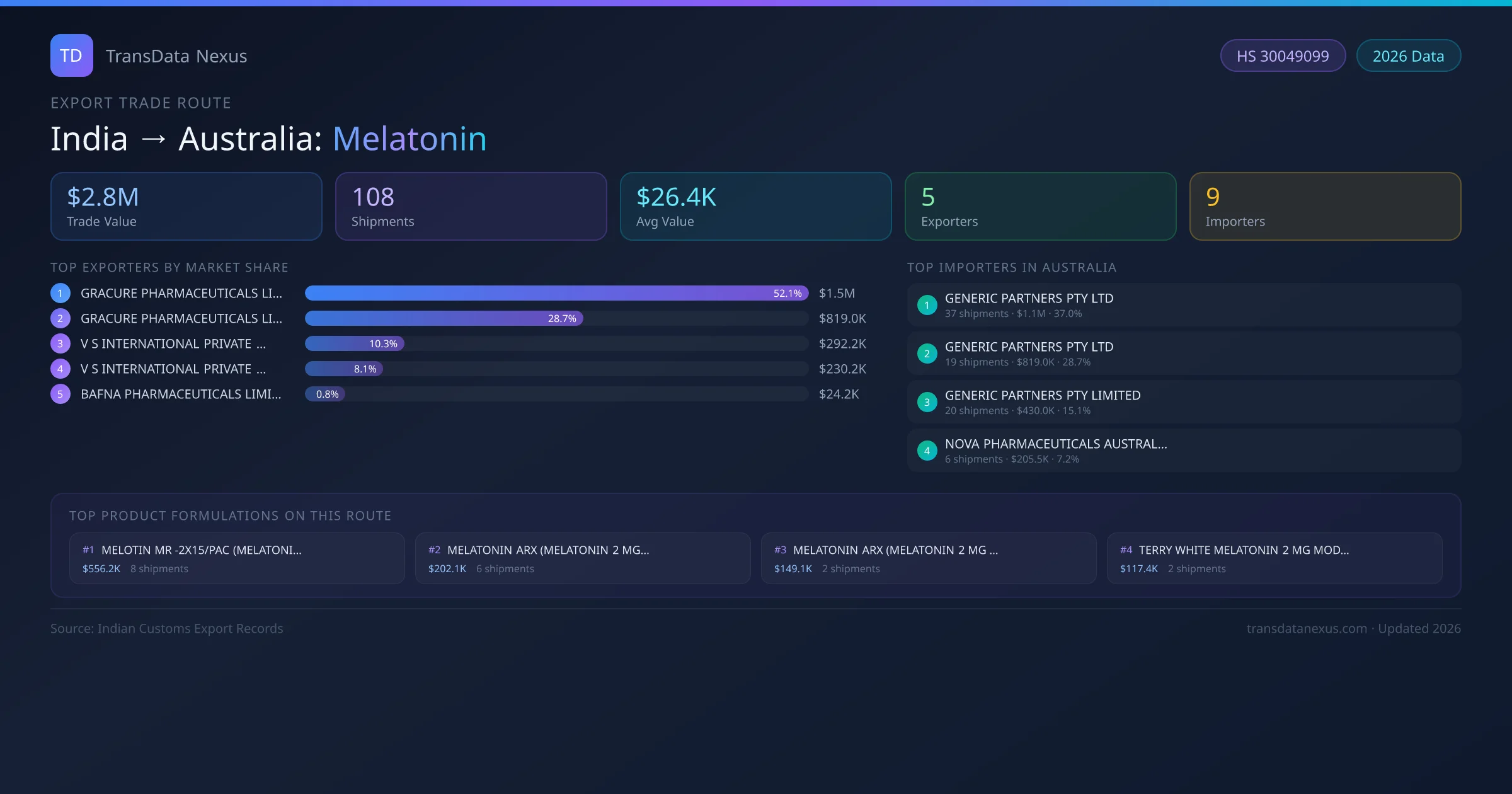 India has recorded 108 verified shipments of Melatonin exported to Australia, representing a combined trade value of $2.8M USD. This corridor is served by 5 active Indian exporters, with an average shipment value of $26.4K USD. The leading Indian exporter is GRACURE PHARMACEUTICALS LIMITED, which accounts for 52% of total export value with 57 shipments worth $1.5M USD. On the buying side, GENERIC PARTNERS PTY LTD is the largest importer in Australia with $1.1M USD in purchases. The top 3 suppliers — GRACURE PHARMACEUTICALS LIMITED, GRACURE PHARMACEUTICALS LIMITED , V S INTERNATIONAL PRIVATE LIMITED — together control 91% of total trade value on this route. All data sourced from Indian Customs (DGFT) shipping bill records. Values reported in FOB USD.