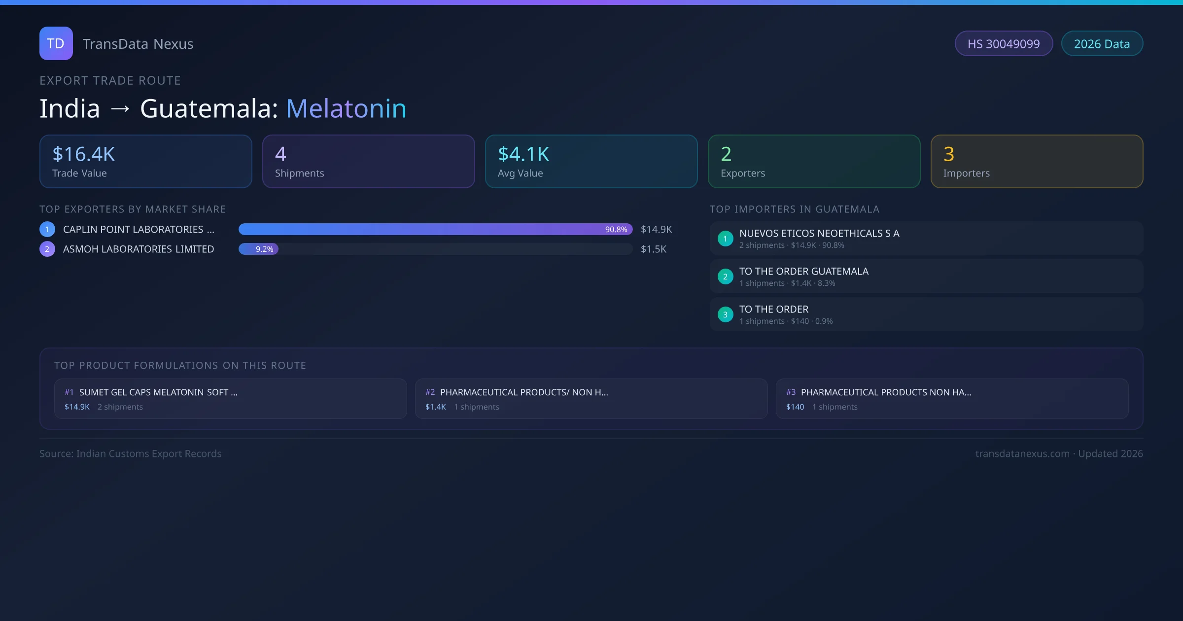 - 1.Route Identification: India to Guatemala export trade corridor identified from Indian Customs (DGFT) records for Melatonin.