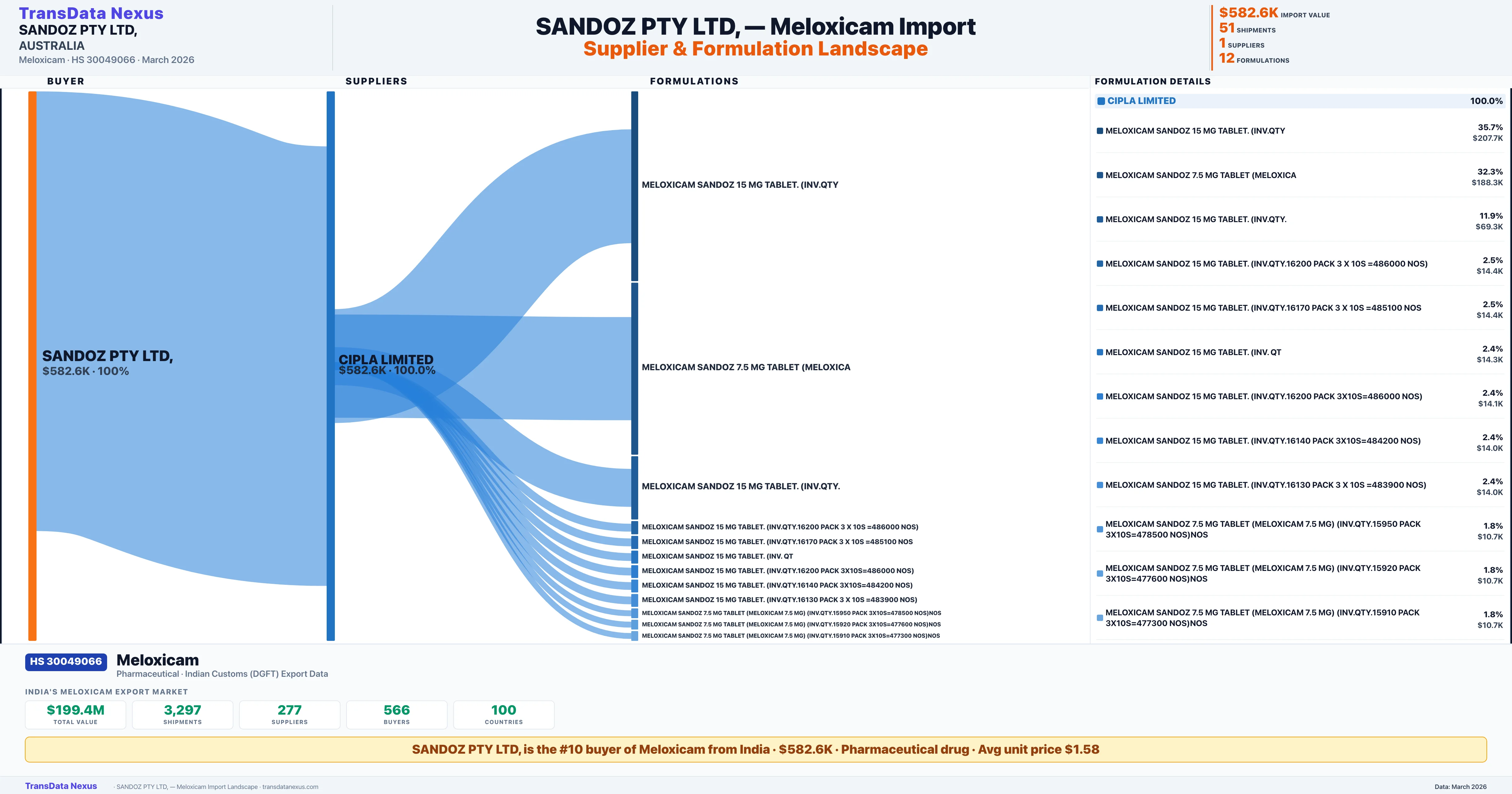 SANDOZ PTY LTD, sources Meloxicam from 1 verified Indian supplier: CIPLA LIMITED ($582.6K, 100.0%). This is based on 51 customs records.