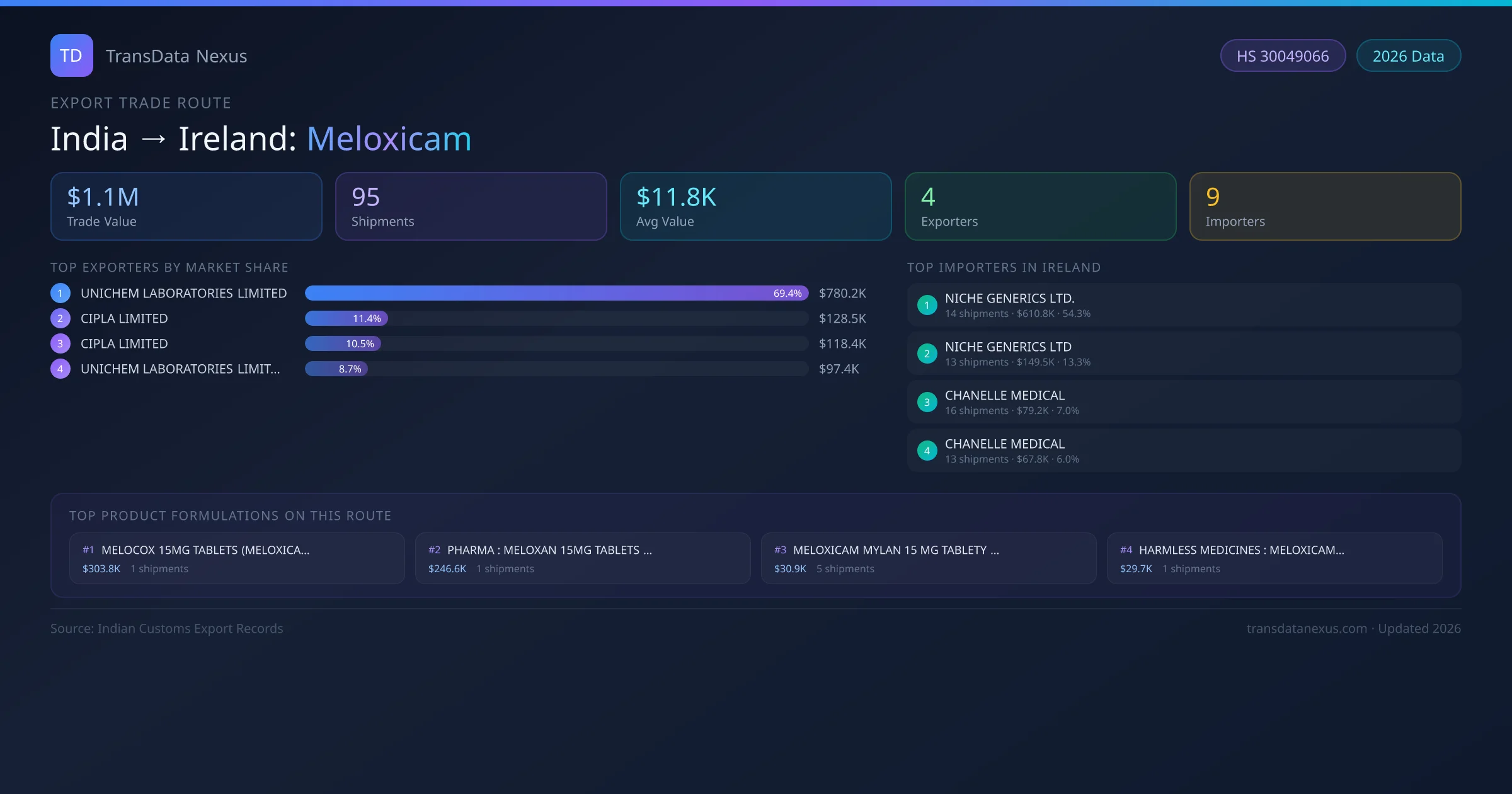 - 1.Route Identification: India to Ireland export trade corridor identified from Indian Customs (DGFT) records for Meloxicam.