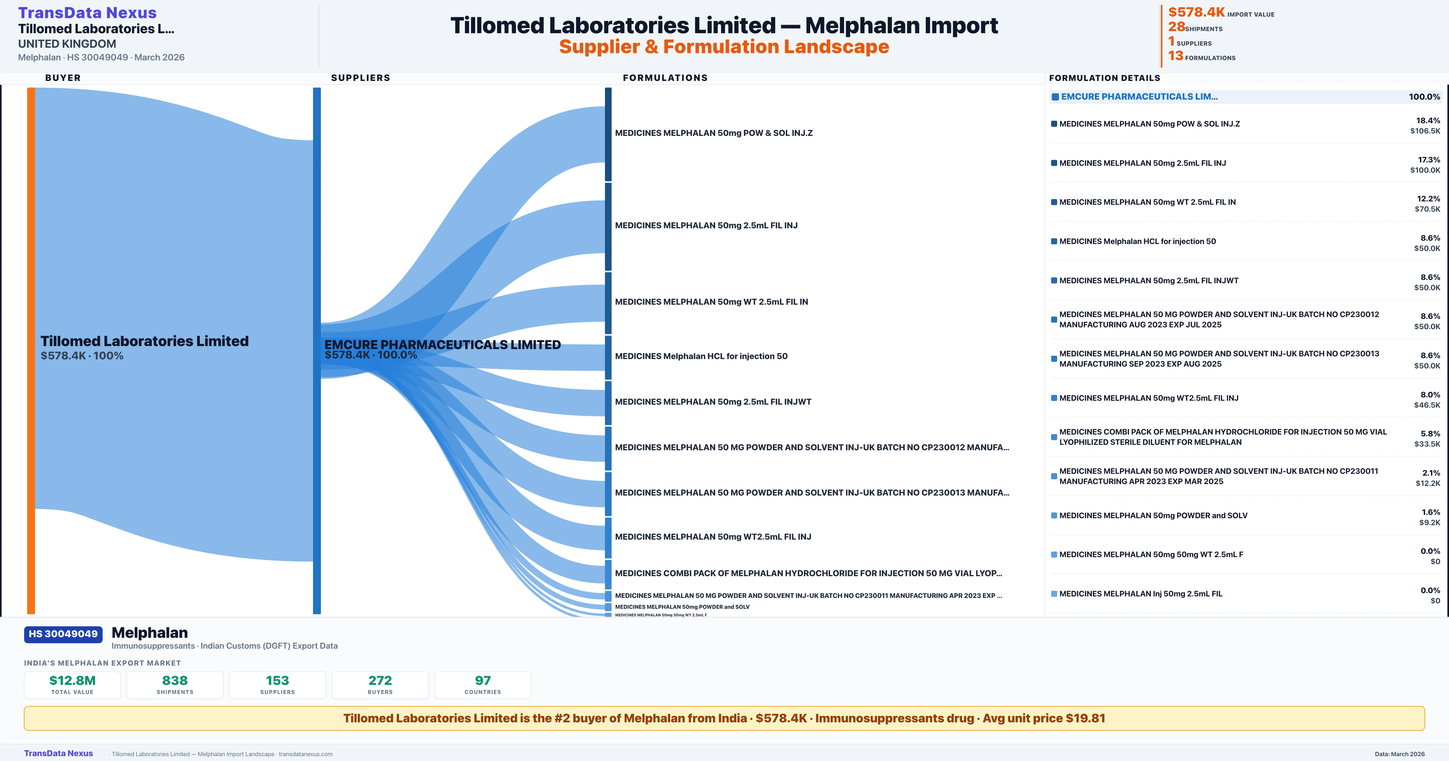 TILLOMED LABORATORIES LIMITED sources Melphalan from 1 verified Indian supplier: EMCURE PHARMACEUTICALS LIMITED ($578.4K, 100.0%). This is based on 28 customs records.