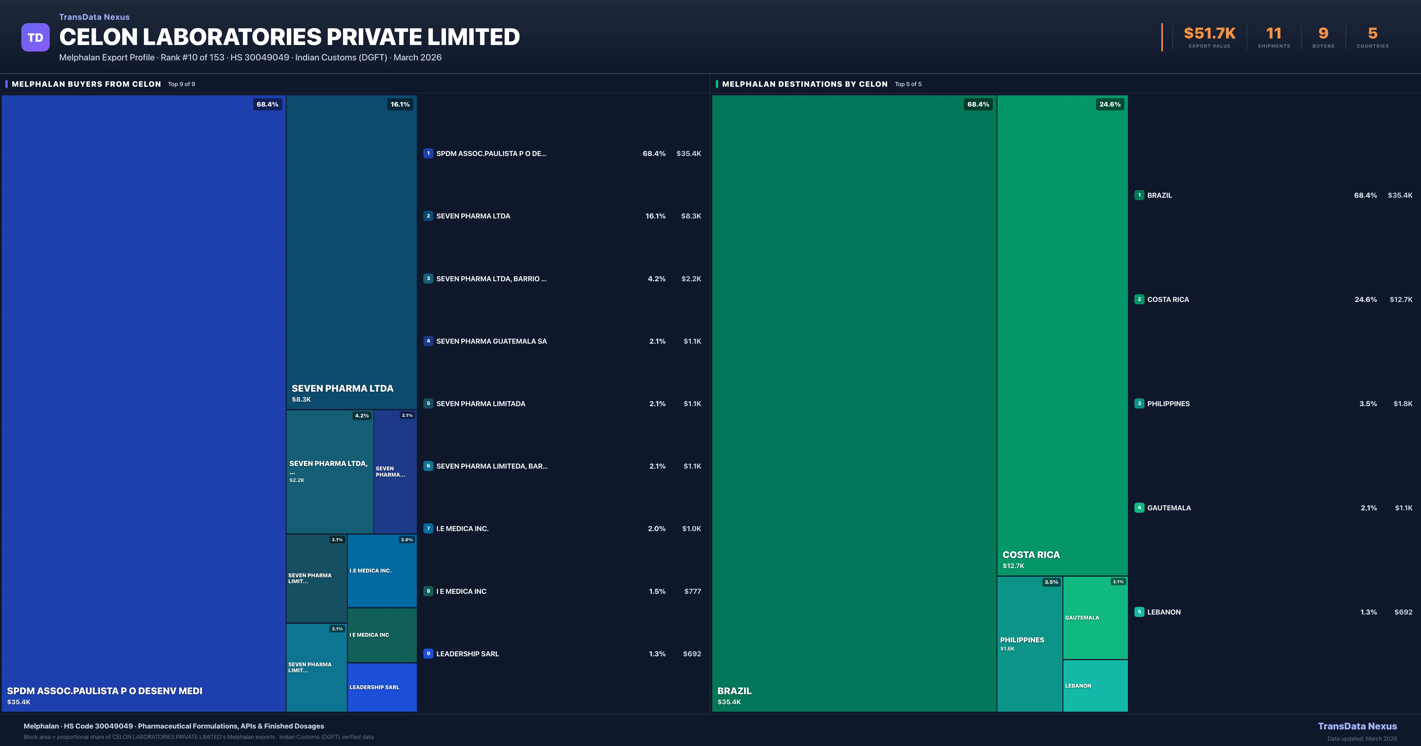 Celon Laboratories Private Limited supplies Melphalan to 9 buyers globally. The largest buyer is SPDM ASSOC.PAULISTA P O DESENV MEDI (BRAZIL), followed by SEVEN PHARMA LTDA (COSTA RICA) and SEVEN PHARMA LTDA, BARRIO COLONIA D (COSTA RICA). These buyers represent pharmaceutical distributors, hospital groups, and government procurement agencies in their respective markets.