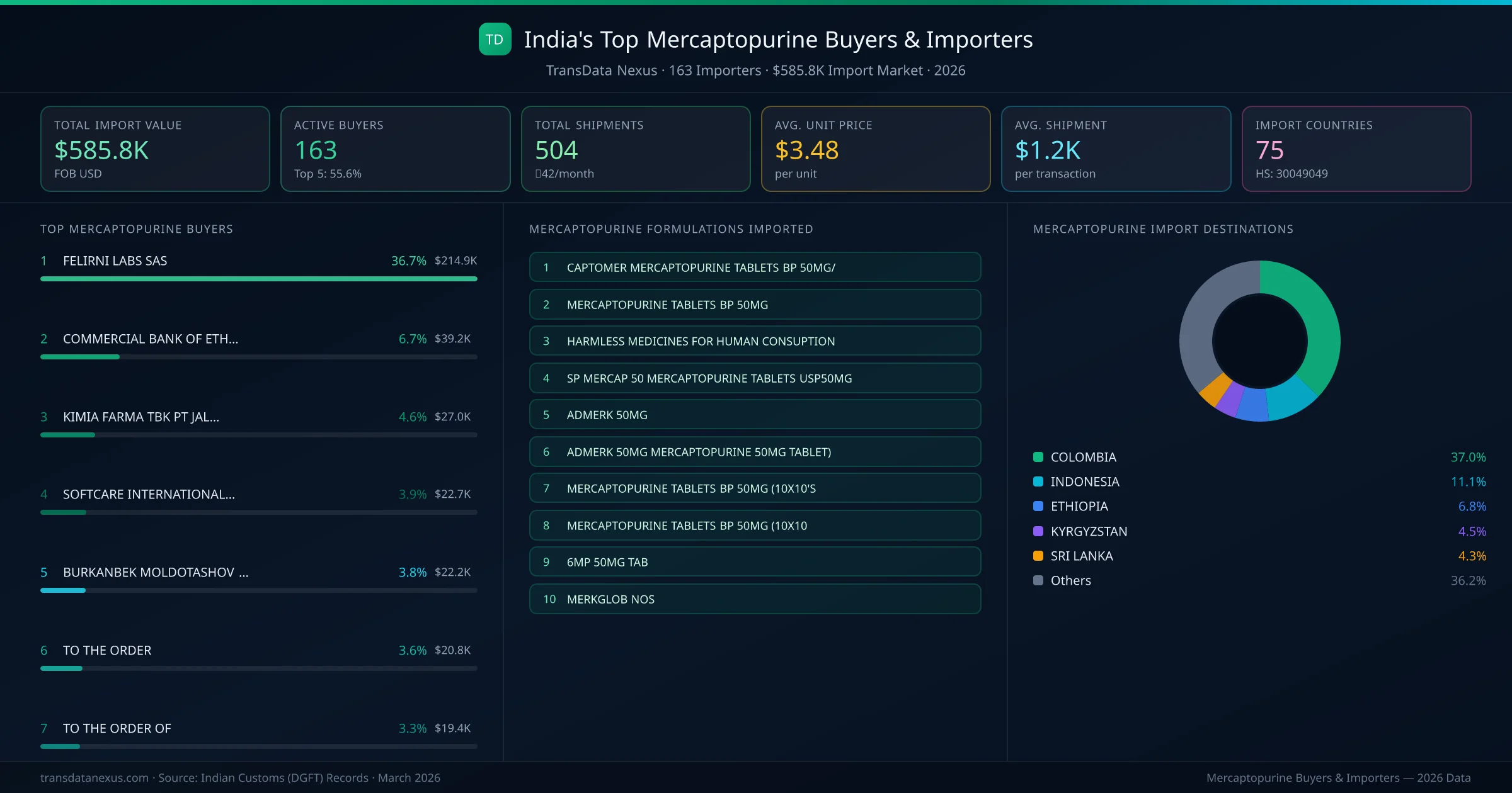 FELIRNI LABS SAS (COLOMBIA) is the leading mercaptopurine importer from India, holding a 36.7% share of the $585.8K market across 504 shipments from 163 buyers. The top 5 buyers โ FELIRNI LABS SAS (COLOMBIA), COMMERCIAL BANK OF ETHIOPIA (ETHIOPIA), KIMIA FARMA TBK PT JALAN VETERAN NOMOR (INDONESIA), SOFTCARE INTERNATIONAL(PVT)LTD (SRI LANKA), ALSHAMELAH FOR TRADING (JORDAN) โ collectively control 54.3% of total import value.