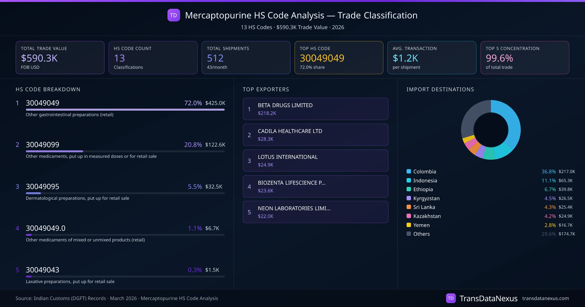India exports Mercaptopurine under 13 distinct HS code classifications, representing a total trade value of $590.3K across 512 shipments. The dominant classification is HS 30049049 (Other gastrointestinal preparations (retail)), accounting for 72.0% of all Mercaptopurine trade at $425.0K. HS 30049099 (Other medicaments, put up in measured doses or for retail sale) follows at 20.8% ($122.6K). The top 5 HS codes together account for 99.6% of total Mercaptopurine trade from India. The average transaction value is $1153. Key importing markets include Colombia, Indonesia, Ethiopia. Leading exporters include BETA DRUGS LIMITED and CADILA HEALTHCARE LTD. Data sourced from Indian Customs (DGFT) shipping bill records.