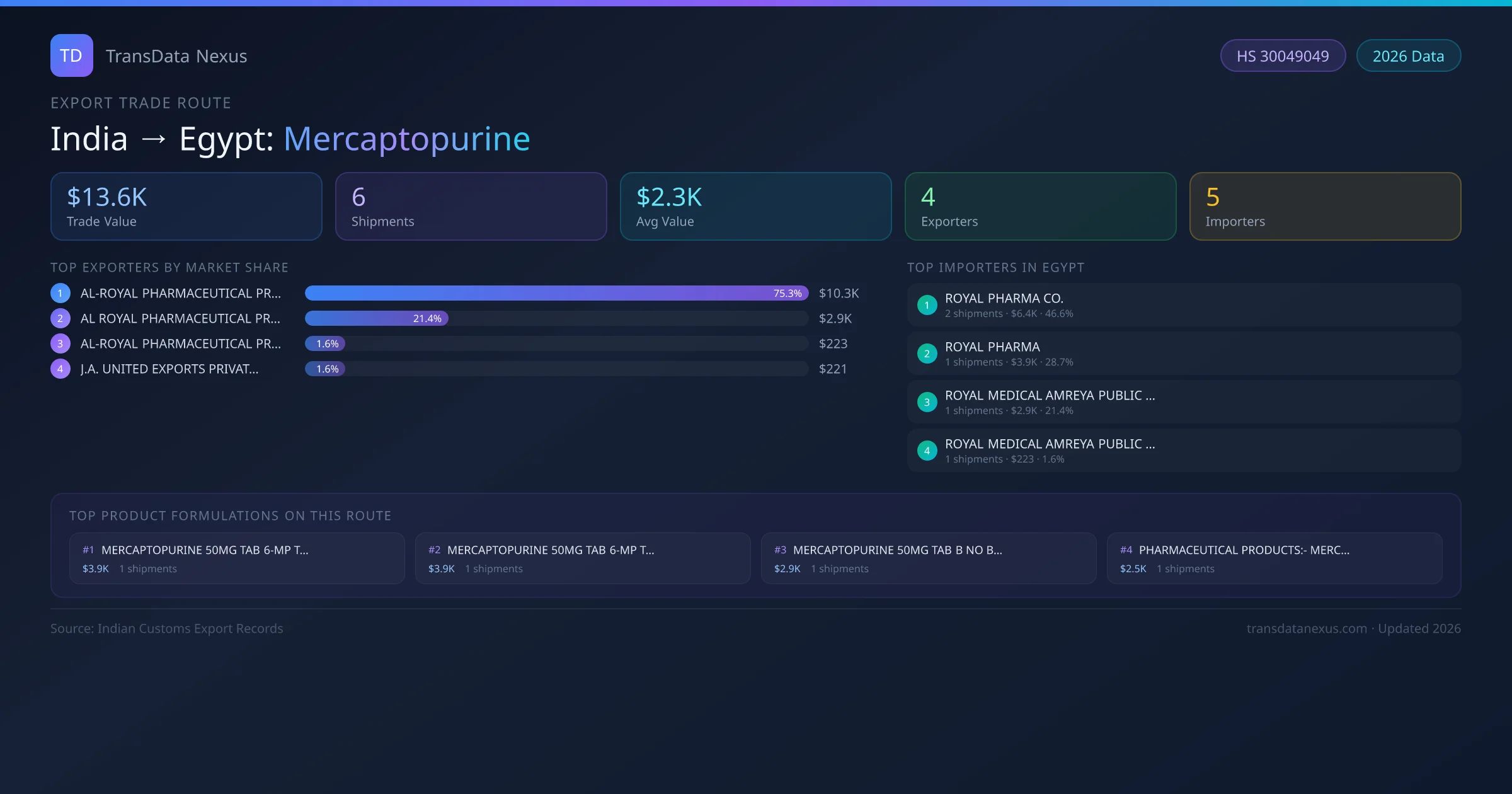 The India to Egypt Mercaptopurine corridor is one of India's established pharmaceutical export routes, with 6 shipments documented worth a combined $13.6K USD. The route is dominated by AL-ROYAL PHARMACEUTICAL PRIVATE LIMITED, which alone accounts for roughly 75% of all export value, reflecting the consolidated nature of India's mercaptopurine manufacturing sector.