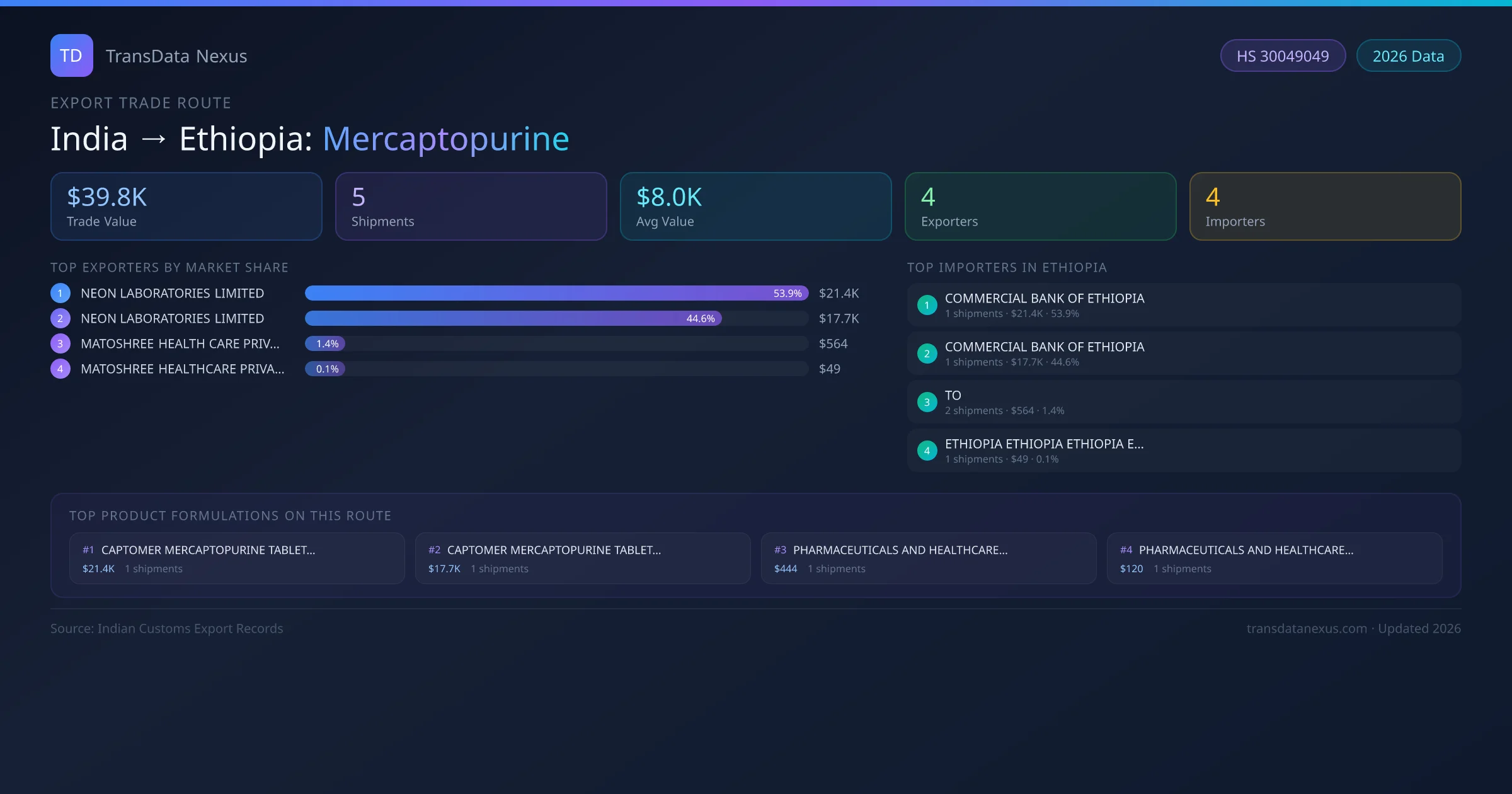 - 1.Route Identification: India to Ethiopia export trade corridor identified from Indian Customs (DGFT) records for Mercaptopurine.