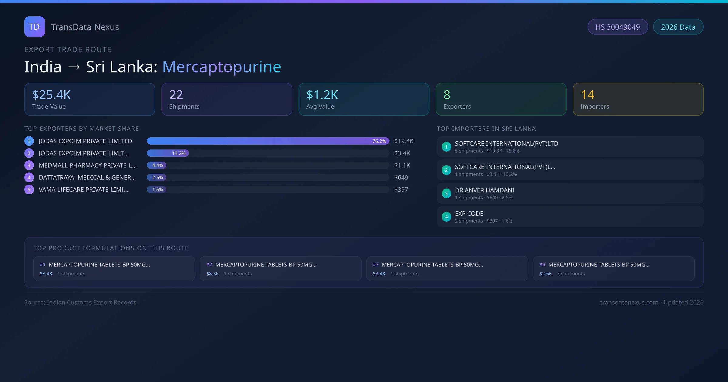 The India to Sri Lanka Mercaptopurine corridor is one of India's established pharmaceutical export routes, with 22 shipments documented worth a combined $25.4K USD. The route is dominated by JODAS EXPOIM PRIVATE LIMITED, which alone accounts for roughly 76% of all export value, reflecting the consolidated nature of India's mercaptopurine manufacturing sector.