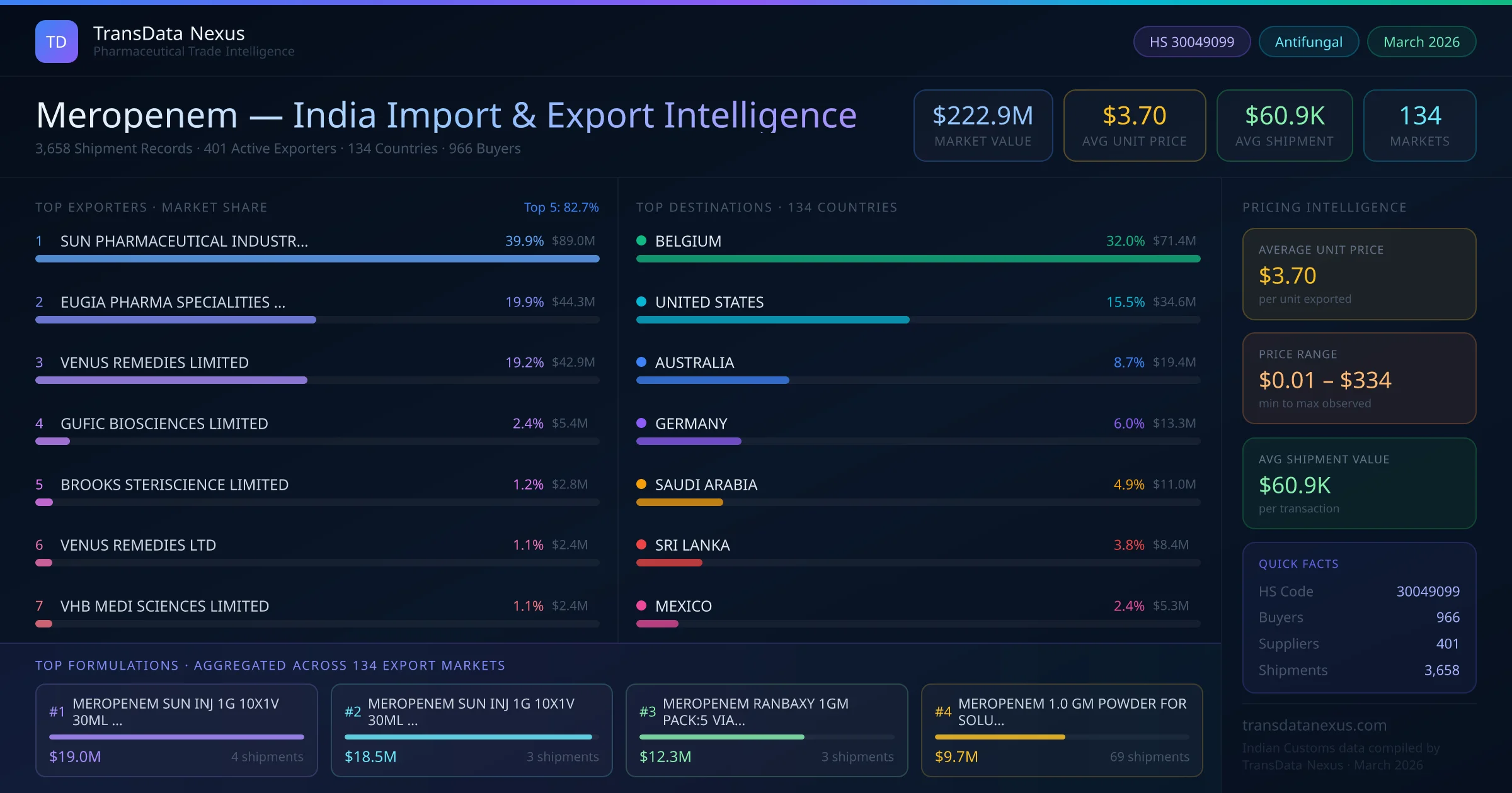 Between 2022 and 2026, India exported $222.9M worth of meropenem across 3,658 verified shipments to 134 countries — covering 69% of world markets in the Advanced Antibiotics segment. The largest destination is BELGIUM (32.0%). SUN PHARMACEUTICAL INDUSTRIES LIMITED leads with a 39.9% share. All figures are drawn from Indian Customs (DGFT) shipping bill records spanning four years of trade activity.