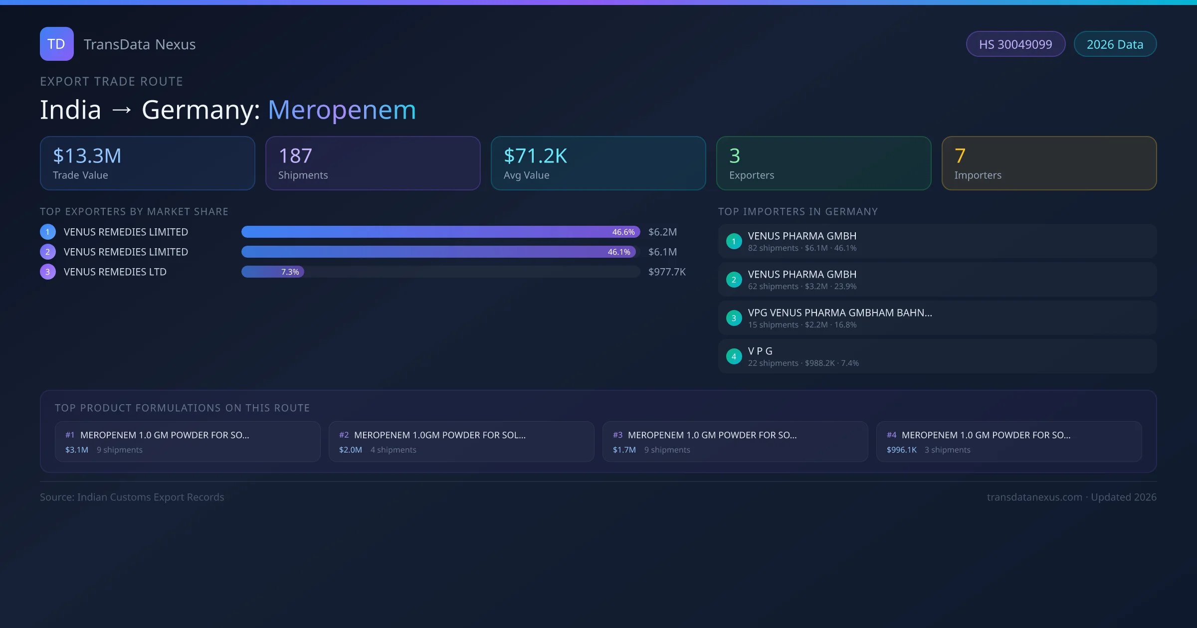 India has recorded 187 verified shipments of Meropenem exported to Germany, representing a combined trade value of $13.3M USD. This corridor is served by 3 active Indian exporters, with an average shipment value of $71.2K USD. The leading Indian exporter is VENUS REMEDIES LIMITED, which accounts for 47% of total export value with 92 shipments worth $6.2M USD. On the buying side, VENUS PHARMA GMBH is the largest importer in Germany with $6.1M USD in purchases. The top 3 suppliers — VENUS REMEDIES LIMITED, VENUS REMEDIES LIMITED , VENUS REMEDIES LTD — together control 100% of total trade value on this route. All data sourced from Indian Customs (DGFT) shipping bill records. Values reported in FOB USD.